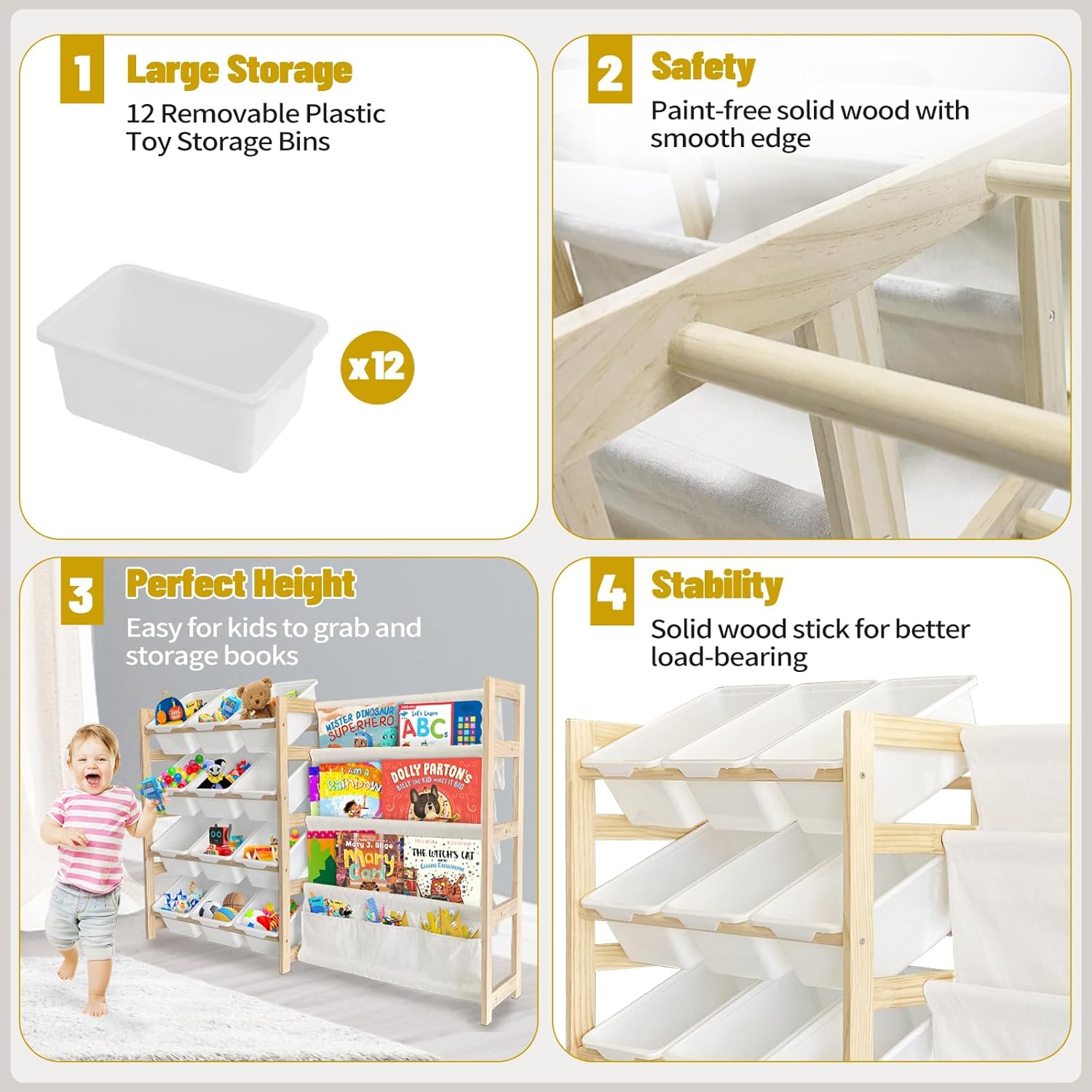 2-IN-1 LARGE STORAGE: Book and toy organizer for kids is not only a toy storage shelf with 12 pcs white removable storage bins, but also a 4-tier sling bookshelf rack, with large capacity storage space. You can assemble the bins and the bookshelves together, or use the bins or the bookshelves alone, according to your preference. Ideal kids toy storage organizer and book rack for kids rooms, nursery room or playroom.