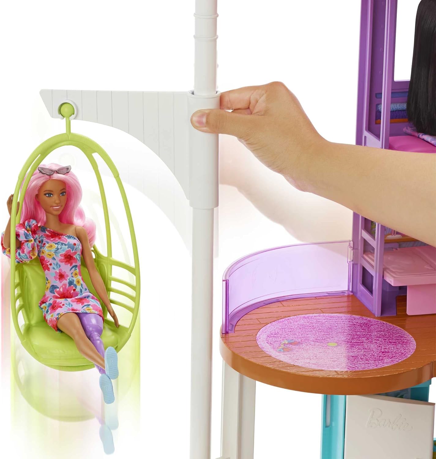 Barbie Vacation House, 2-Storey Fully-Furnished Barbie House with 6 Play Areas, Swing Chair Elevator, 30 Accessories, Fold and Store, Toys for Ages 3 and Up, One Toy House, HCD50