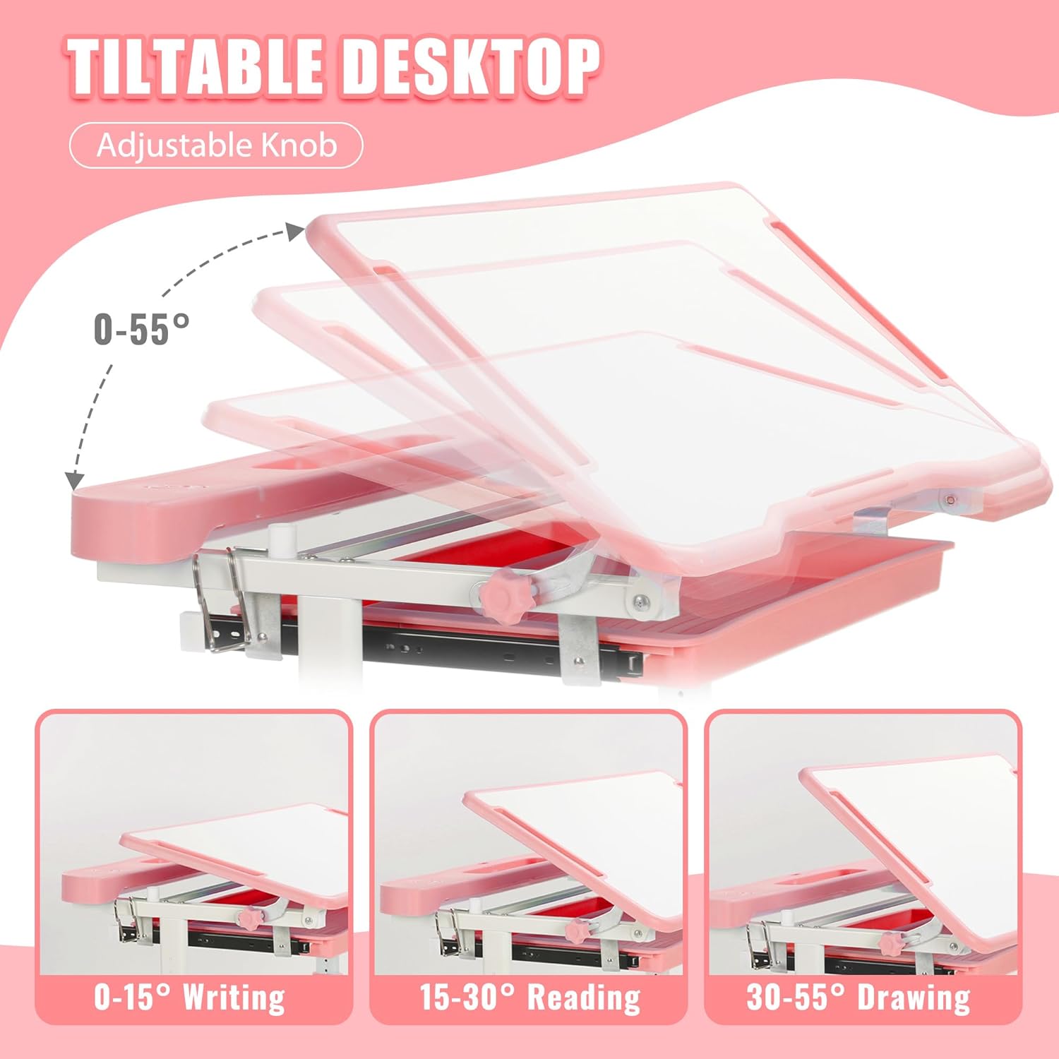 Rengue Kids Desk and Chair Set Height Adjustable School Study Desk and Chair with 55° Tiltable Desktop, 3 Modes&3 Brightness LED Lamps, Storage Drawer and Metal Hook for Boys Girls, Pink