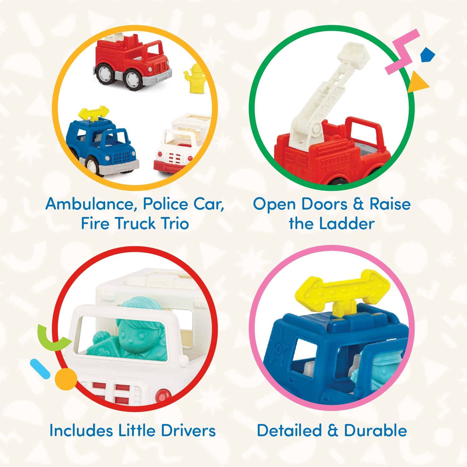Rescue Truck Trio: Ambulance, police car, and fire truck toys for kids.