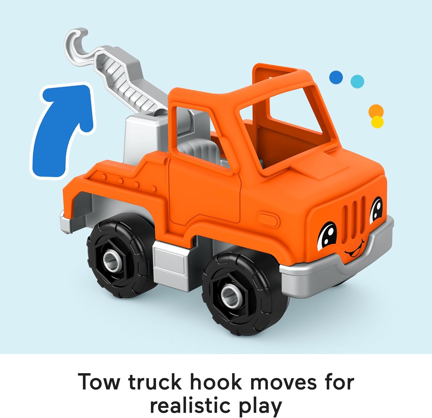 ​Familiar themes to inspire storytelling, including rescue vehicles like a fire truck and tow truck, a farm tractor, bulldozer construction vehicle, and recycle garbage truck