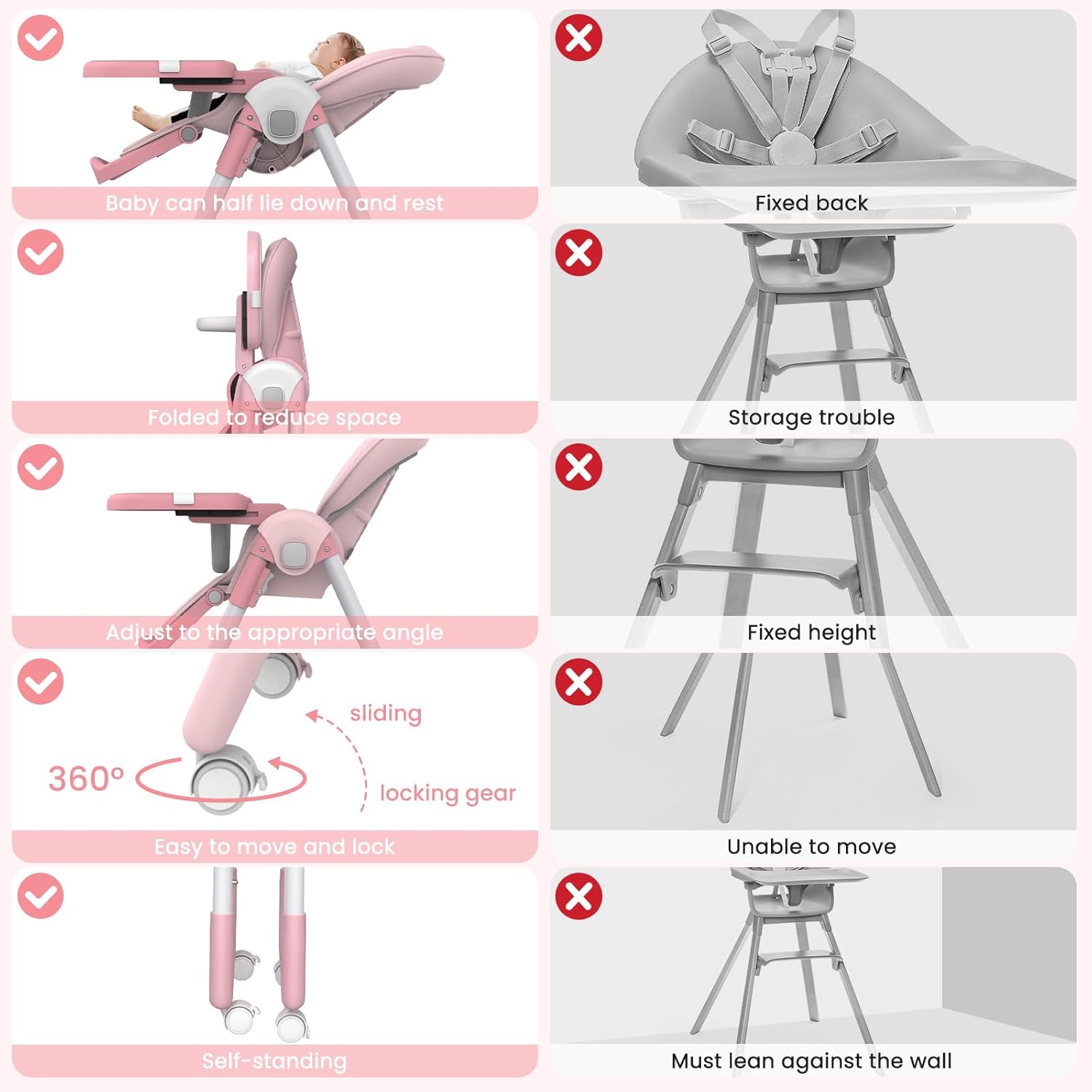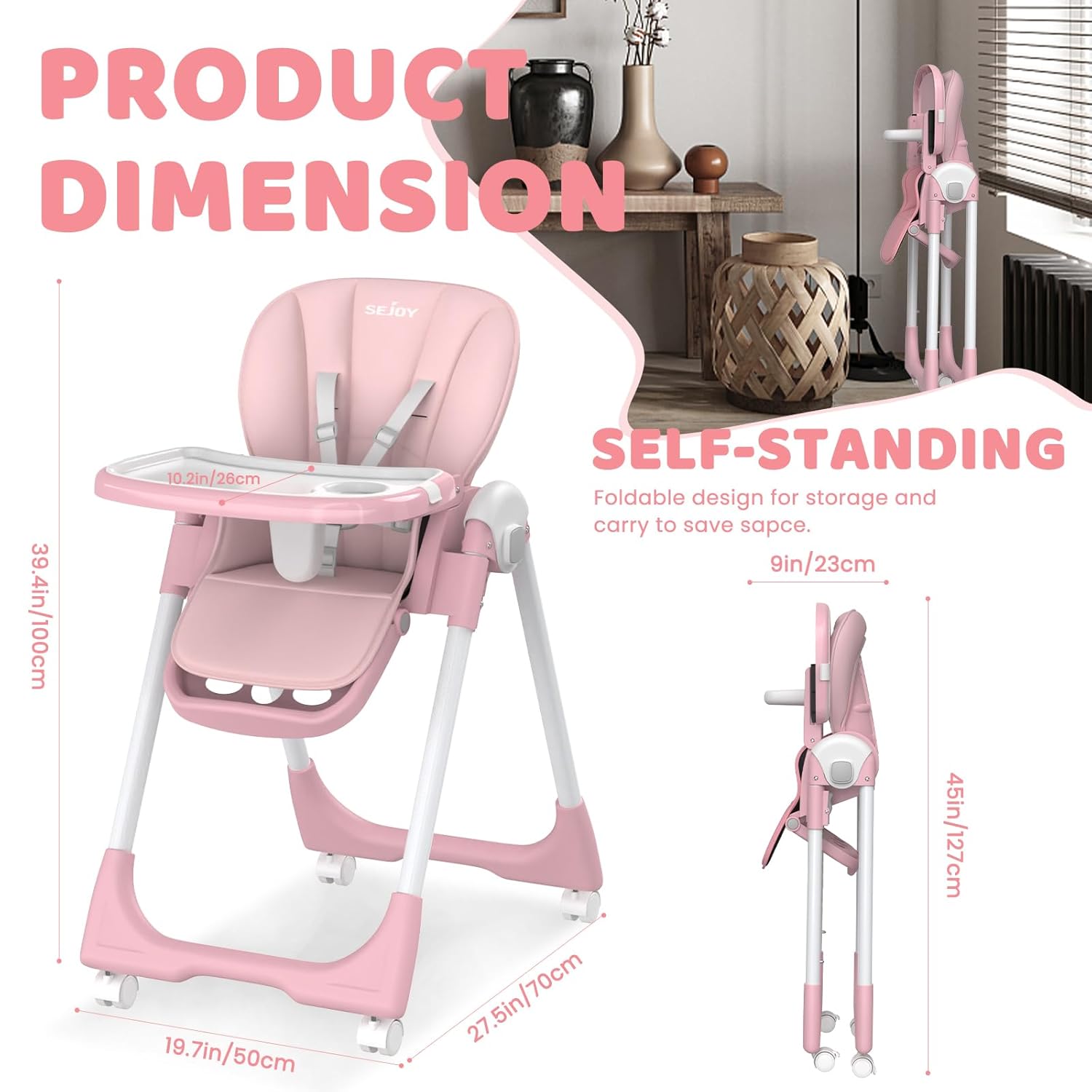 【Adjustable Feeding Chair】 Sejoy High chair for babies and toddlers equipped with 5 Adjustable backrest positions (from 100°to 140°), 5 convertible seat heights (24.4in-30.7in/62cm-78cm) and 3 adjustable footrest and tray positions. Babies can play, eat, relax, recline, or nap on the high chair any time/any where.