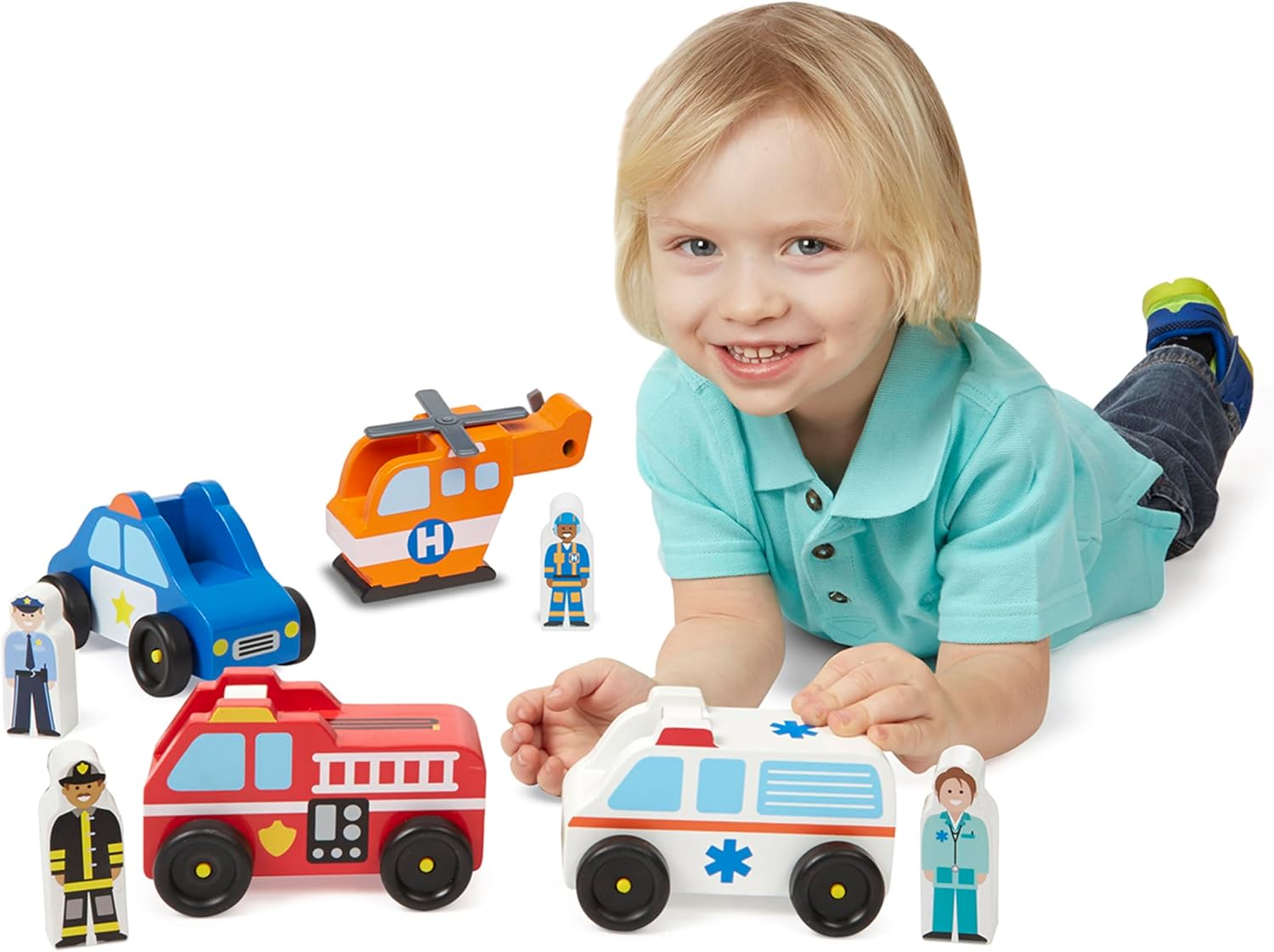 Race to the rescue with this collection of four wooden emergency vehicles! Sturdy wooden construction and moving parts on each vehicle means the ambulance, rescue helicopter, police car, and fire engine will stand up to endless of hours of constructive play. Wooden emergency worker play figures fit into each of the vehicles and can also be removed for additional imaginative play opportunities.