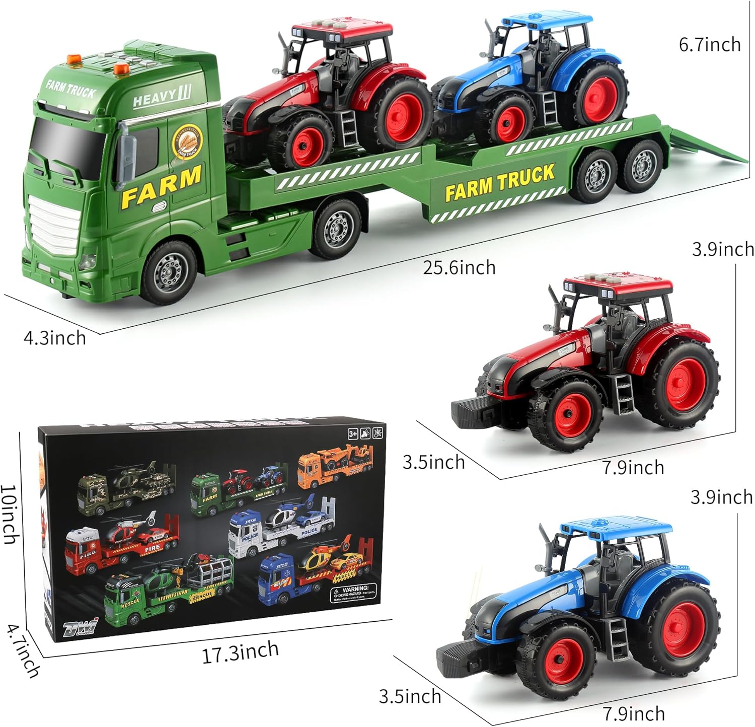 【Multi-purpose Transportation Vehicle】:Large friction powered farm truck size:25.59*4.33*6.69 inch.The head of the truck can be separated,turn left and right,and the tailboard can move up and down to simulate the transportation scene of a real semi-trailer.