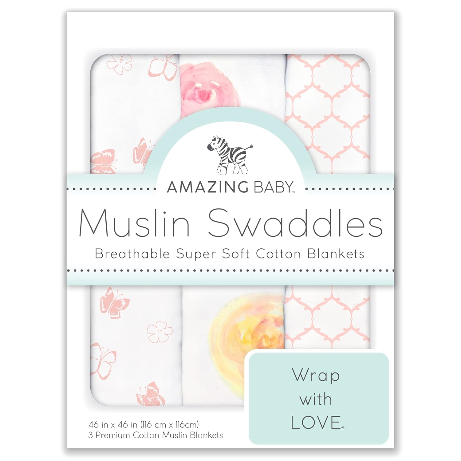 Amazing Baby premium quality muslin swaddles get softer with every wash. Rest easy when your baby is lovingly swaddled in premium 100% cotton muslin. The open weave increases breathability and reduces the risk of overheating. The generous size and square shape makes swaddling easy as 123. Beyond swaddling, use as a nursing cover, sunshield on stroller, playmat for tummy time, and more. 46 x 46 inches (116 x 116 cm). Machine washable.