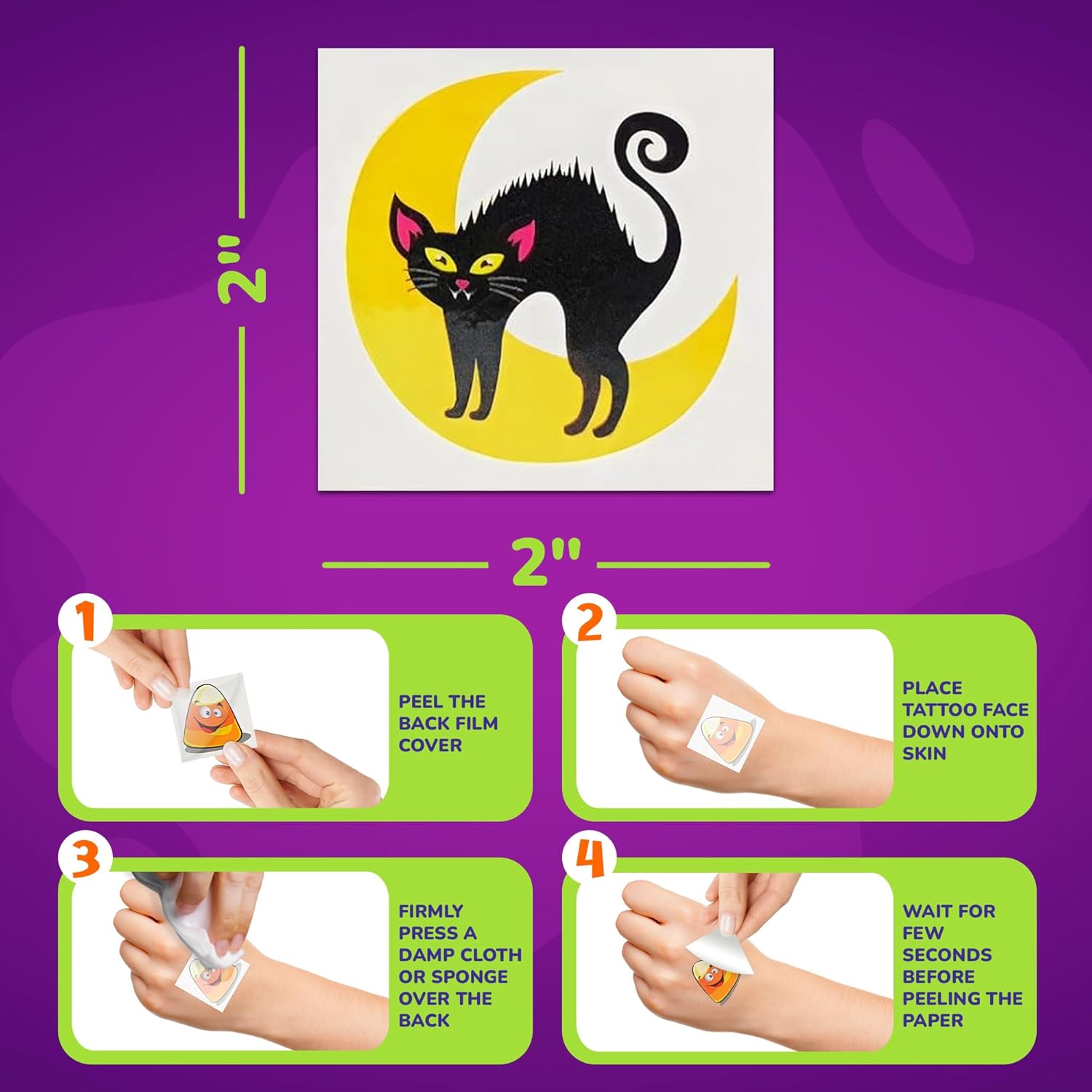 SAFE AND SIMPLE TO USE: Your little one’s safety is always our top priority. That’s why we’ve ensured these temporary Halloween tattoos for children are completely non-toxic. And they are easy to apply and long-lasting too! Just apply water to wear and enjoy the adorably creepy goodness.