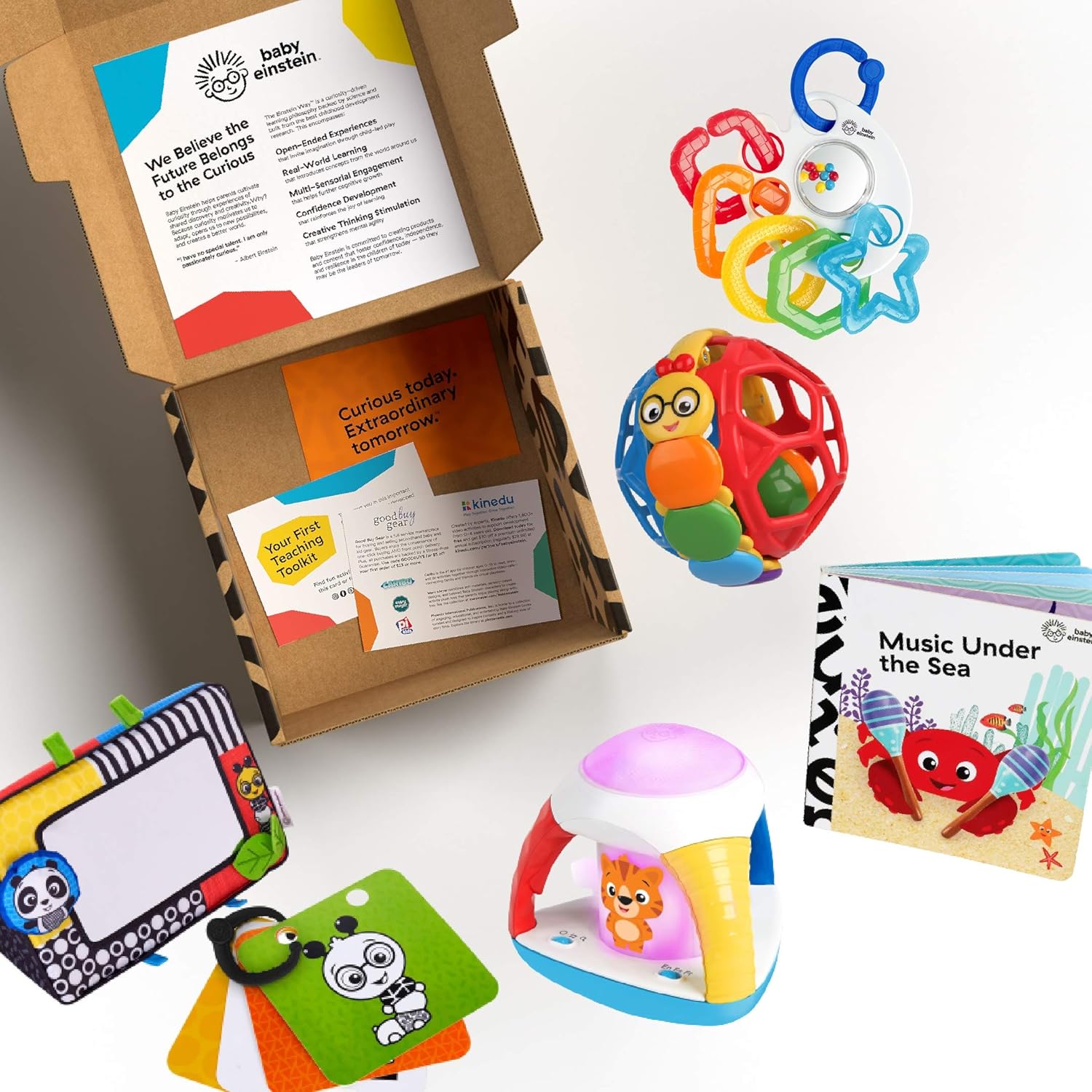 Art is an especially crucial area of learning because it assists in developing skills like critical thinking, collaboration, and communication. The Baby’s First Art Teacher™ Developmental Toy Kit from Baby Einstein™ will help you introduce your little one to art in age-appropriate ways. As a gift box, it delivers a delightful unboxing experience with 8+ items inside. Light up baby’s curiosity as you explore color mixing on the Curiosity Kaleidoscope™. Help promote baby’s visual development and self-discovery during tummy time with the Flip for Art™ baby-safe floor activity mirror with high-contrast, take-along flash cards. Baby will love being their own muse! As Baby’s First Teacher, you’ll enjoy taking art lessons on the go with the travel-friendly Shake, Rattle & Soothe™ Teether Link Ring Toy and Bendy Ball™ Rattle Toy. The Music Under the Sea™ Board Book introduces shapes and colors of the sea, and the pages are easy for little hands to turn. In short, this play kit of baby & toddler toys provides support for parents and caregivers who want to help their infants with everything from problem-solving to color recognition skills. And for gift-givers, it’s an impressive gift set to spark curiosity and creativity in your favorite aspiring artists, ages newborn and up. Everything’s gender neutral, so it works as a baby shower gift for a boy or girl—or even special occasions like baby’s first Christmas. Batteries are not included.