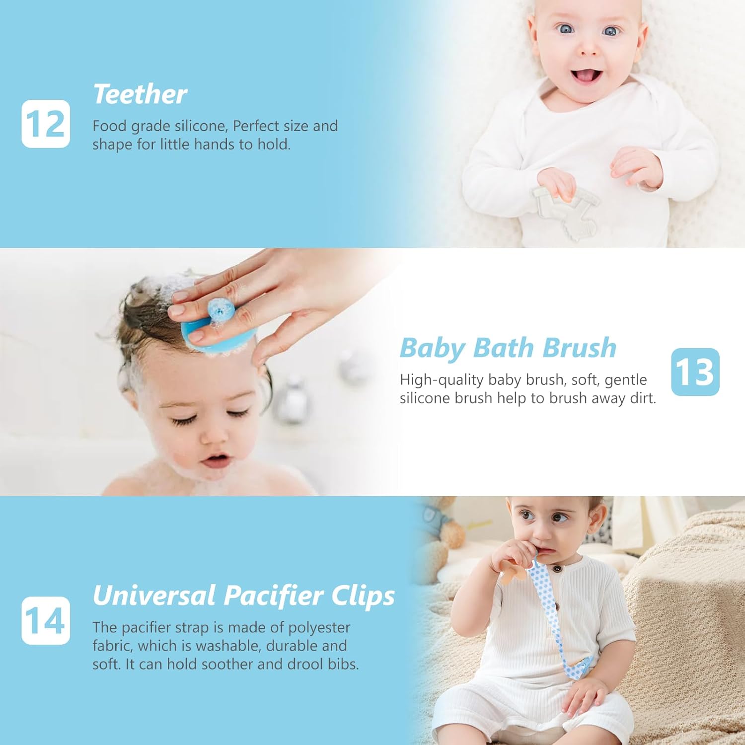 【We Have Upgraded!】As a baby essentials, we have updated our baby grooming kit through public feedback. The 14pcs set includes: (1)baby nail clipper, (2) round safety scissors, (3) glass nail file, (4) Nasal aspirator, (5) Baby brush, (6) Baby comb, (7)medicine dropper, (8) LED light tweezers, (9) Finger toothbrush, (10) Pacifier clip, (11) LED Light Ear Wax Removal Tools, (12)meter, (13) Teeth er, (14)Baby Bath Brush, (15) storage box. Completely meet your baby’s daily needs!