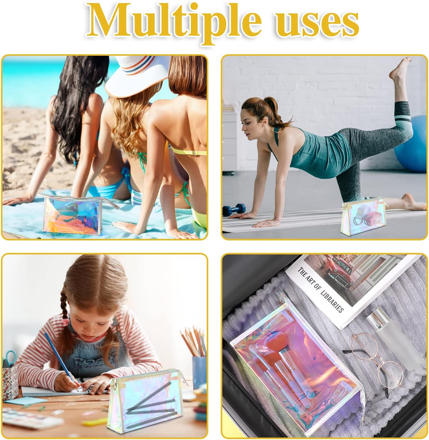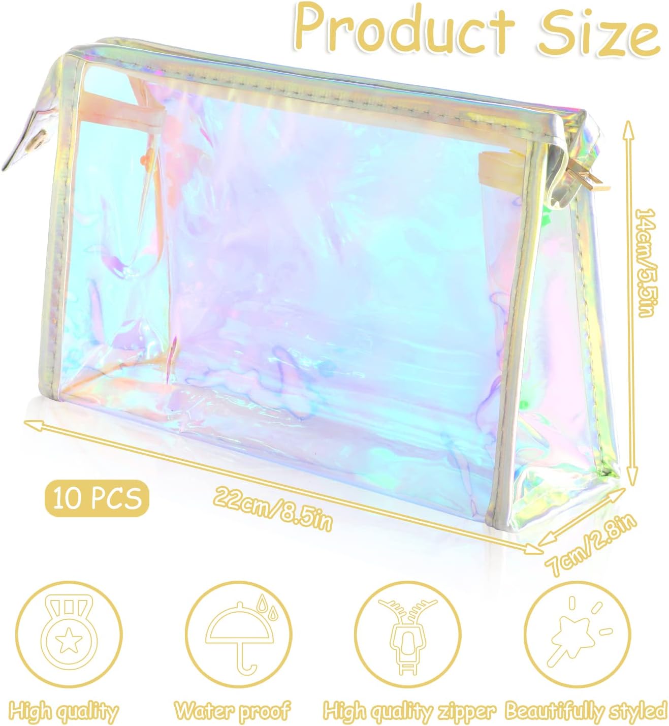 【10 Cosmetic Bags】You will get 10 pieces holographic iridescent cosmetic bags (pink edging), simple and stylish, with dimensions of 8.5×5.5×2.8 inches, with enough space to hold all your cosmetics.