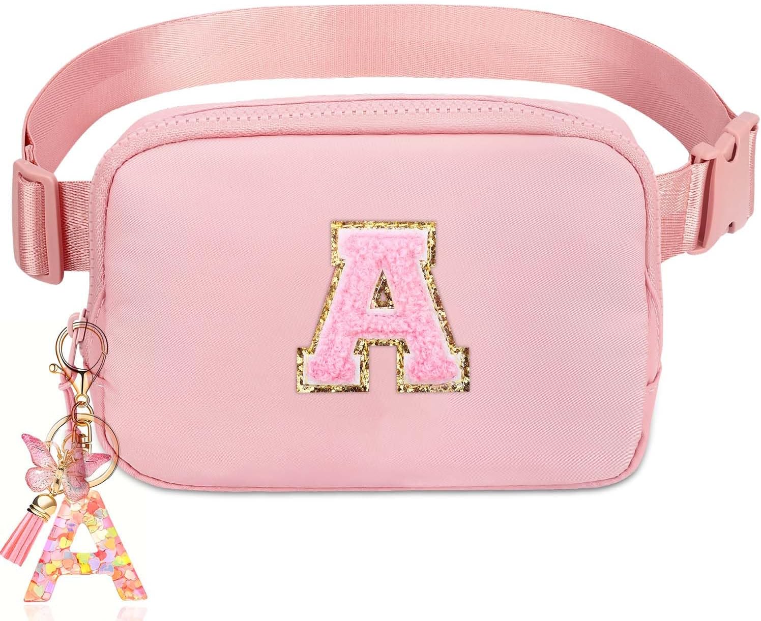 LETTER PATCH FANNY PACKS FOR GIRLS-The personalized fanny pack features a monogram stitched in a cotton towel embroidery process that, unlike glett material, not only won’t snag and fall off, but is also comfortable to the touch