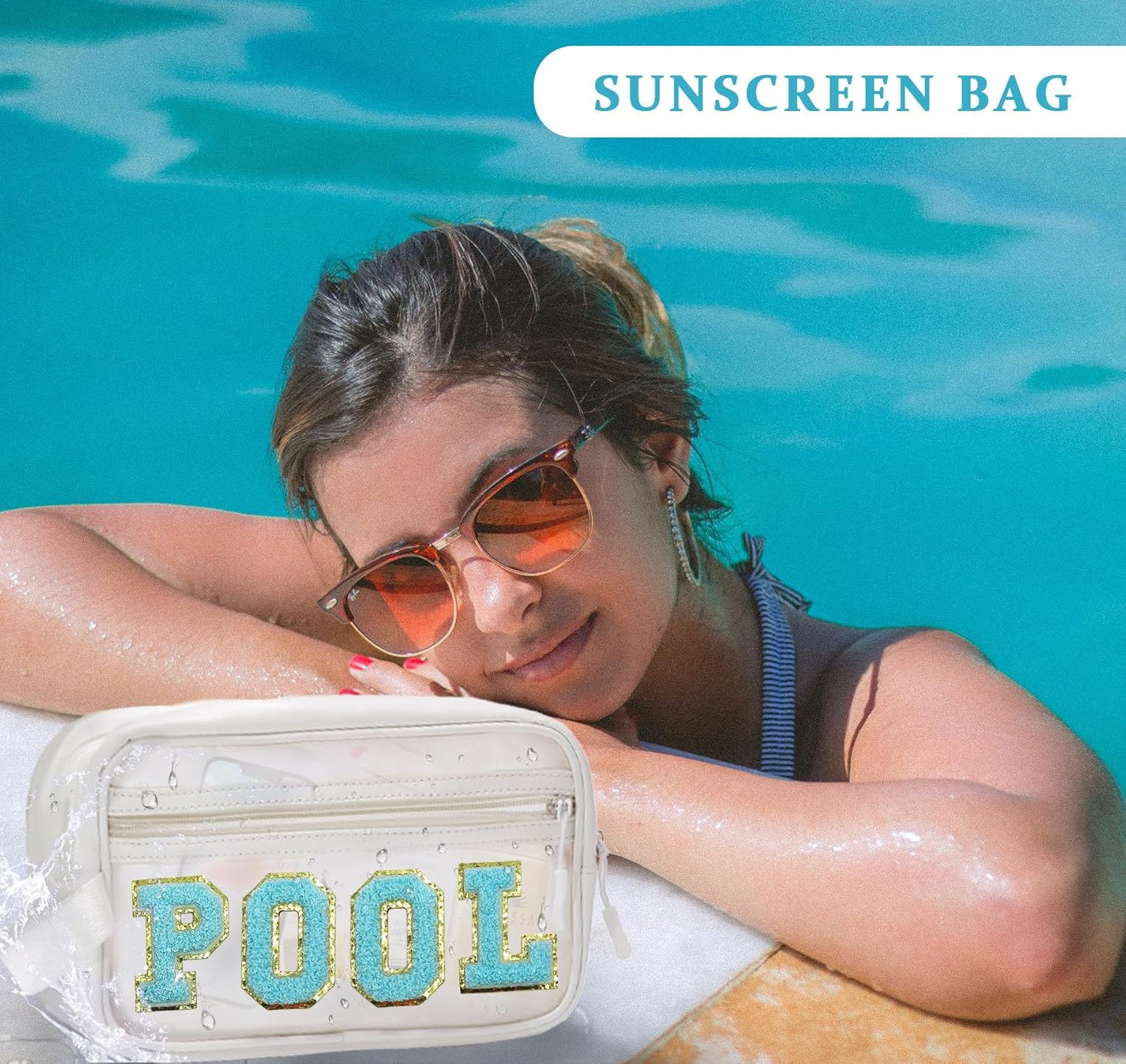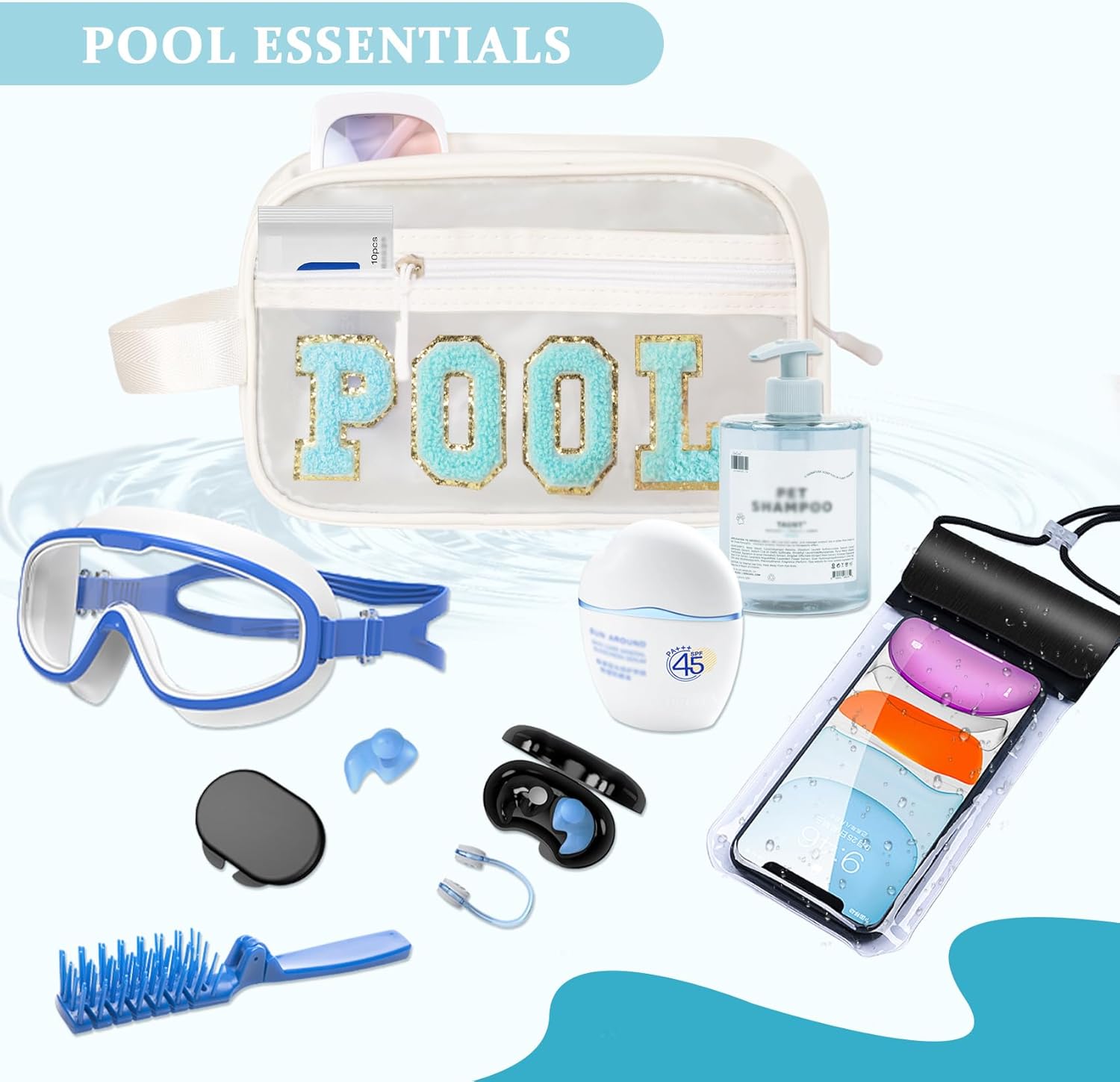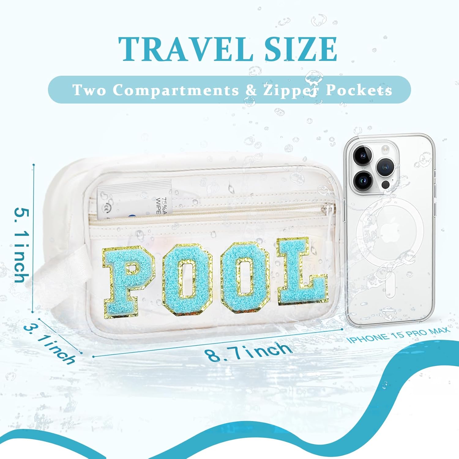 [Clear Makeup Bags with Chenille Letter Patches POOL] Travel Must-have transparent make up bags and toieltries pouch for women mom sister teens aged 13 and above.