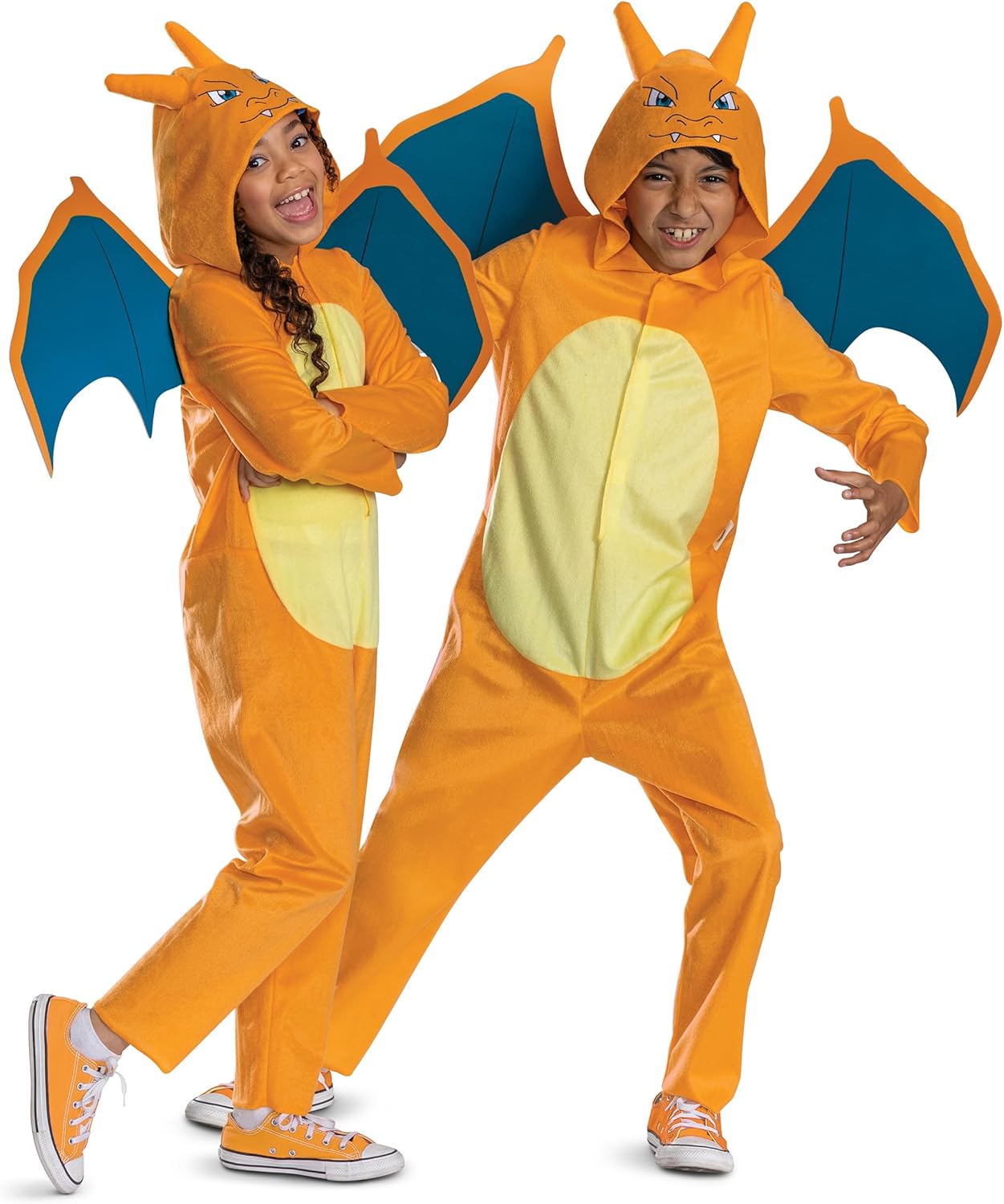 Unleash the power of a fan-favorite Pokémon with the Charizard Classic Jumpsuit Costume! This officially licensed look features all the fiery details you’d expect, including a bright orange soft jumpsuit with an attached yellow belly and a sitched down tail. The hood showcases embroidered eye details and 3D horns for an expressive Charizard face, while detachable stiff felt wings add dramatic flair to every pose. A Pokémon-branded tag at the hip ensures authenticity for any true Trainer. Whether you’re flying into a costume party, trick-or-treating, or just powering up for playtime, this cozy unisex jumpsuit delivers classic Charizard energy in a comfy, easy-to-wear design that Pokémon fans will love. Includes hooded jumpsuit with detachable wings