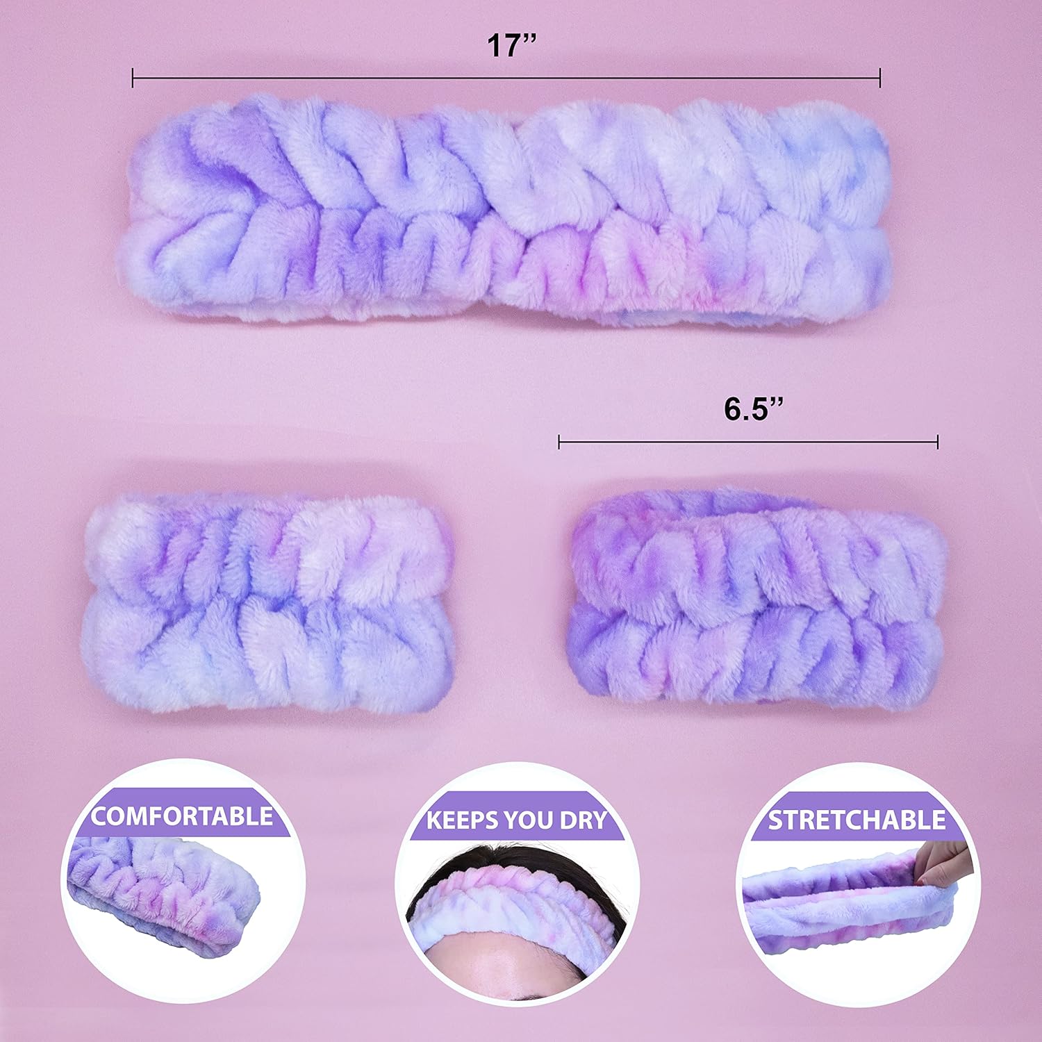 Unlike other face wash headband styles, this fluffy face washing headband includes two matching tie dye wristbands that prevents water from running down your arms