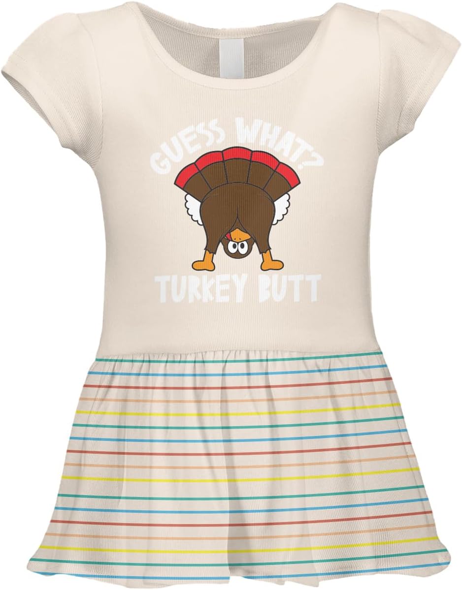 Looking for the perfect dress to wear for Thanksgiving? Look no further! This funny Guess What? Turkey Butt – Thanksgiving Infant/Toddler Baby Rib Dress is a comfortable, affordable way for your little girl to express themselves. Whether purchasing for a son, daughter, niece, nephew, or grandchild you can be sure to put a smile on their face. The design is printed on a soft, comfortable, 100% combed ringspun cotton short sleeve dress. This amazing dress will become a staple in your child’s wardrobe. Features 1×1 baby rib, double needle hemmed ruched sleeves, and gathered skirt hem to provide style and durability.