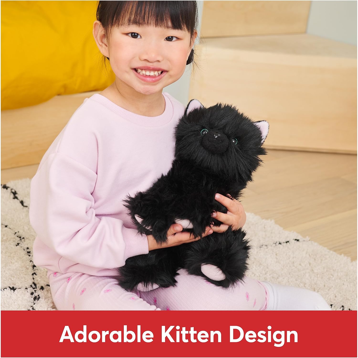 XAVIER KITTEN PLUSH: Xavier is an adorable, super-fluffy black kitten with pink paw pads. Sitting at 9”, this pretty kitty also has bright green eyes, a pink nose, an embroidered smile, and a unique, slightly floppy design that makes him more huggable