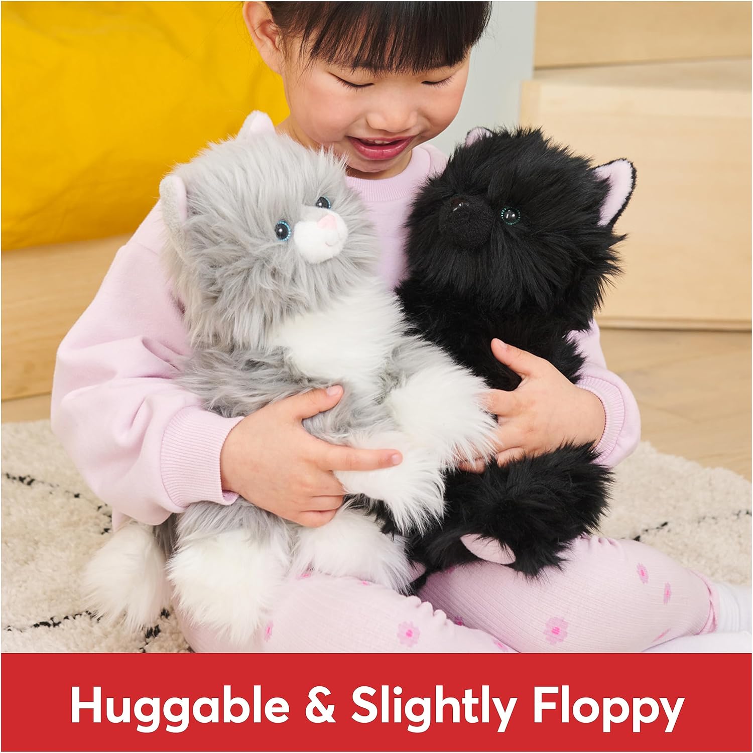 XAVIER KITTEN PLUSH: Xavier is an adorable, super-fluffy black kitten with pink paw pads. Sitting at 9”, this pretty kitty also has bright green eyes, a pink nose, an embroidered smile, and a unique, slightly floppy design that makes him more huggable