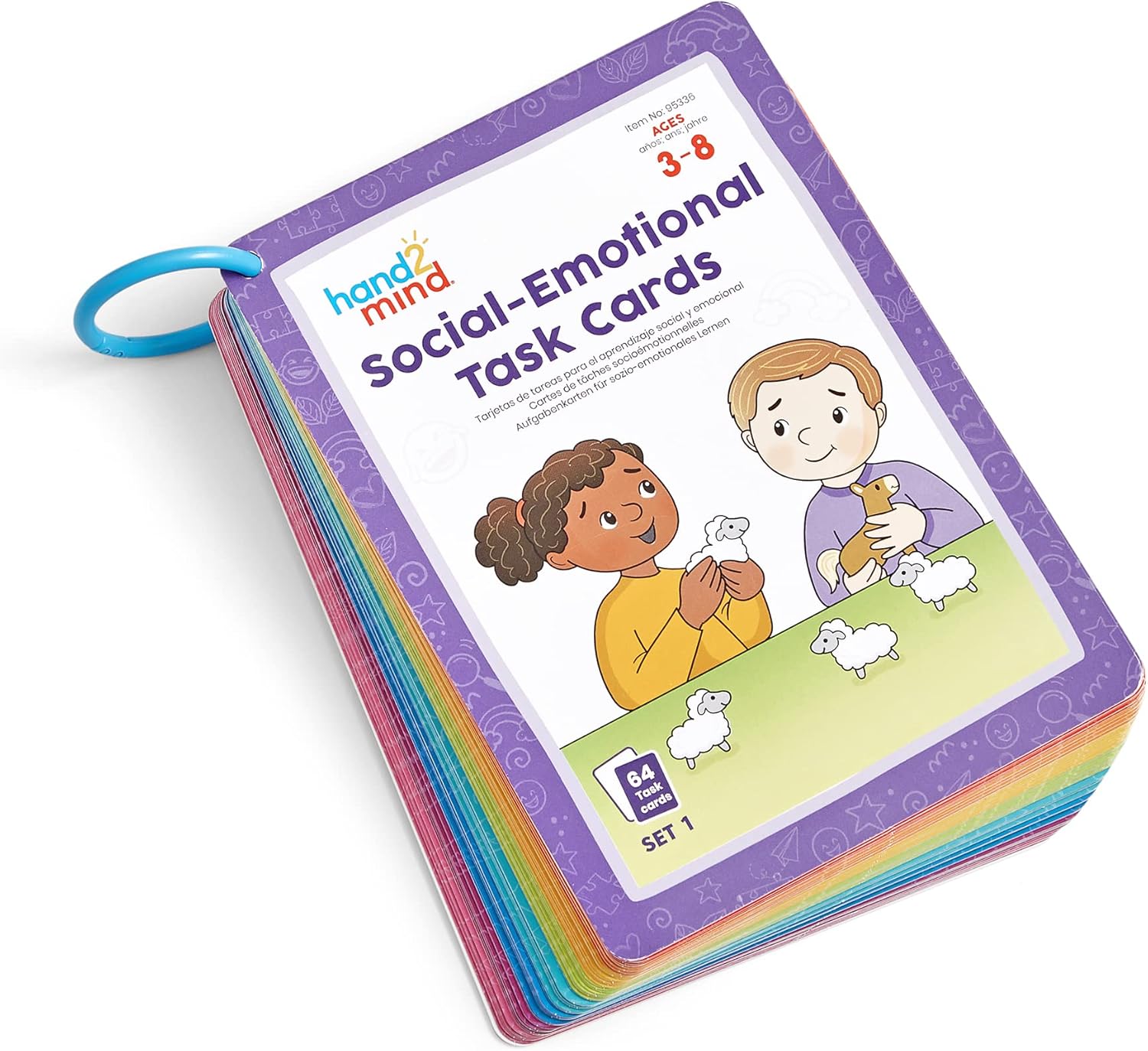These unique task cards encourage children to explore social-emotional development concepts including feelings, self-regulation, kindness, growth mindset, goal setting, problem solving, collaboration, mindfulness, diversity, and empathy. 64 engaging cards include age-appropriate, hands-on activities for individuals, pairs, or small groups. Each card displays a prompt that encourages children to have fun while learning important social emotional skills. These Task Cards can be used to encourage deeper discussions about feelings and emotions and how to deal with them. They’re a great resource for at home or in the classroom and fit nicely in any calm down corner. For over 55 years, hand2mind has encouraged hands-on learning and discovery, driving deeper understanding and helping children unlock their full potential. hand2mind is a pioneer in social emotional learning products that help kids manage their emotions and build mindfulness for kids. From kindergarten to middle school, hand2mind has you covered with products designed to enhance learning in the classroom and the world around us. Through innovation and discovery, we strive to find new ways to encourage students in math practice, literacy activities, STEM education, Social Emotional Learning, and more!