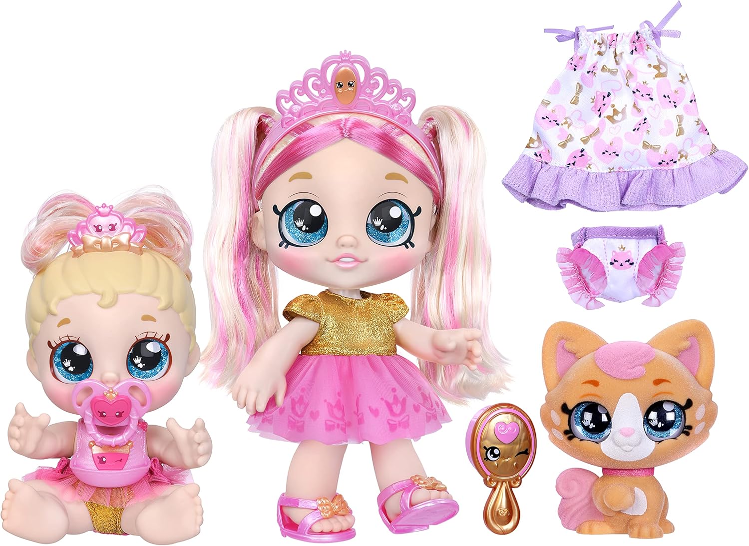Say hello to the most Pawsome Royal Family you will ever meet – Tiara Sparkles, Teenie Tiara and Prince Purrfection! This adorable family love to share everything, especially their love of candy! With the sweetest Royal Candy scent, these 2 sisters love playing together with their kitten, and their favorite game is Dress Up! This Exclusive Kindi Kids Scented Sisters Pack comes with 2 changeable outfits. Tiara Sparkles has 2 beautiful dresses to wear with the sweetest tiara print and Teenie Tiara has 2 delightful diapers to change into. Both girls love wearing their pretty gold and pink Tiaras. These easily changeable outfits can quickly be put on and taken off depending on how you want to play! They are the perfect size for small toddler’s hands to play with. Pick up Tiara Sparkles and see your toy come to life! With big glittery eyes, colorful hair, changeable shoes and an adorable head that bobbles with every movement! Squeeze Teenie Tiara’s tummy and she will blow you a Royal Candy scented kiss! Just like bigger Kindi kids, she has big glittery eyes. Teenie Tiara just loves being held and played with. You won’t be able to stop squeezing her chubby, squishy arms and legs as she wobbles and bobbles like a real little baby! Teenie Tiara has 2 removeable Diapers, Pacifier and Bib for extra fun play. But let’s not forget their kitten Prince Purrfection. This little kitty loves being brushed and groomed with his Shopkin Brush. Watch him closes his eyes as you stroke him on his head with his brush! This family of cuties can’t wait to have a magical, royal day with you!