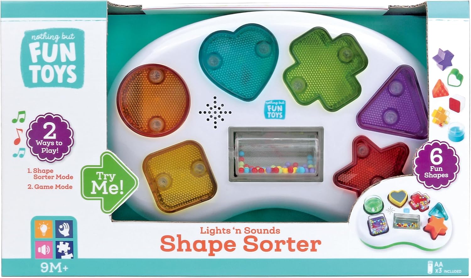 NOTHING BUT FUN TOYS: LIGHTS N’ SOUNDS SHAPE SORTER features six different colorful shapes that fit into the corresponding base. Each shape has unique sensory features and colors. Kids enjoy learning colors and shapes as they align the shapes with the matching base. The bases light up and each plays a sound when kids match them correctly with the shapes. There are two modes; first begin with shape sorter mode and once children have that down, turn on game mode to increase difficulty and fun. Our shape sorter can speak 3 languages and effectively teaches kids shapes in English, Spanish and French. Batteries are included (3 x AA) meaning it’s ready to play. This toy is perfectly designed for children ages 9 months and up. Nothing But Fun Toys is a curated collection of historically top selling plastic preschool toys which have been contemporarily redesigned by world class product engineers carefully designed for children to have the best experience imaginable. All our toys come in best-in-class consumer friendly packaging perfect for gifting. PRODUCT DIMENSIONS: 11.2″ x 2.8″ x 11.0″.