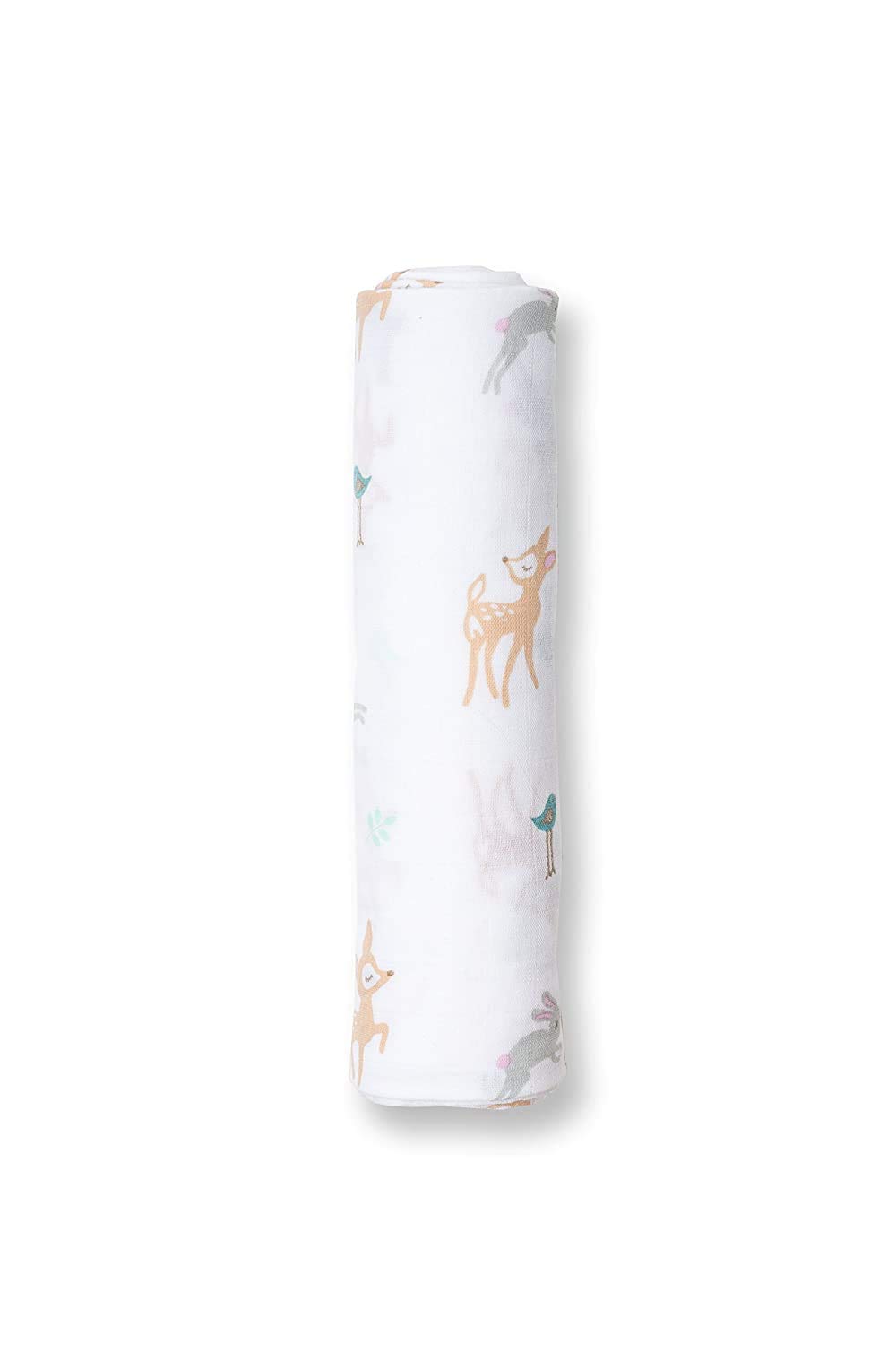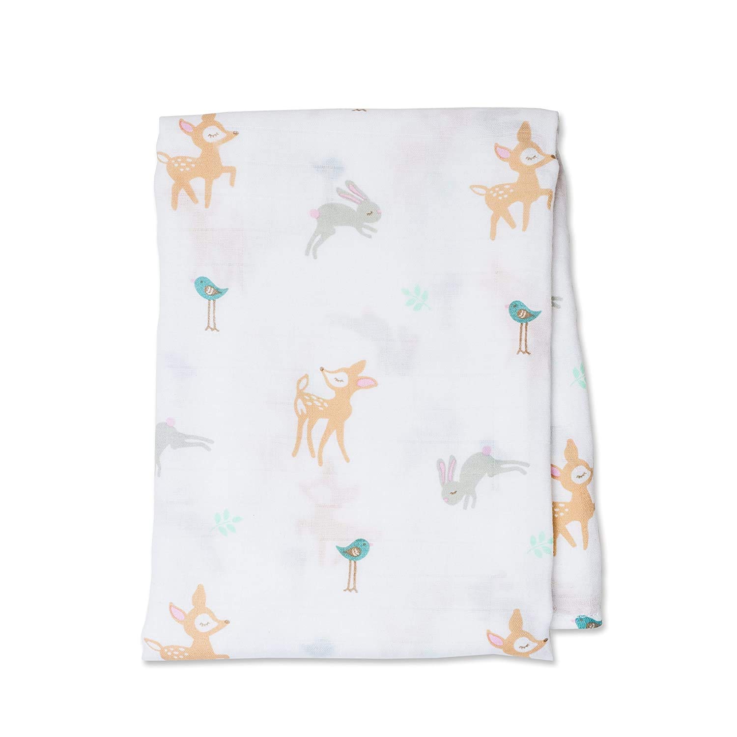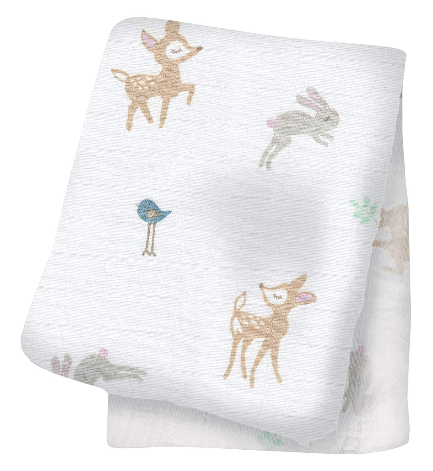 PREMIUM STYLE FOR THE MODERN NURSERY: White muslin with pattern of darling fawns, grey bunnies, and blue birds