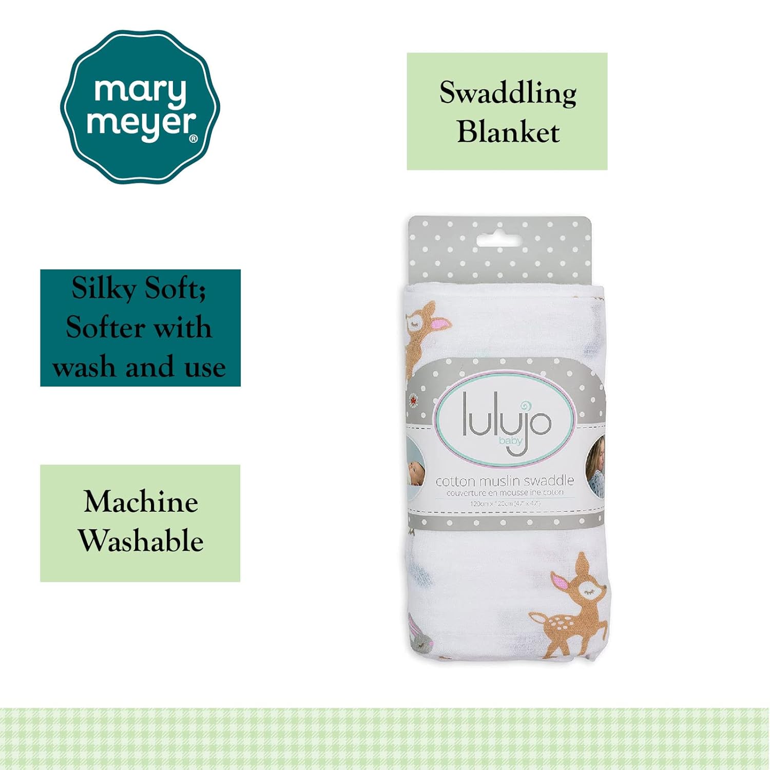 Wrap baby up in the soft embrace of this extra-large swaddle blanket. 100% Cotton, 47 x 47-inch square blanket is made with finely woven muslin cloth. This soft and breathable blanket helps baby feel safe and secure while swaddled and prevents spontaneous movements (startle reflex) from waking them. Durable and versatile, it can also can be used as a nursing cover, change mat, over the shoulder burp cloth, stroller cover, and more. Machine washable muslin is pre-washed, dual layer, and becomes softer with use. Machine wash cold with like colors, tumble dry low. Brought to you by Lulujo Baby, a proudly Canadian company behind premium baby essentials. At Lulujo Baby, our love is in the details.