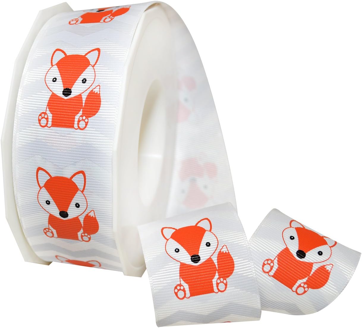 This New ribbon is a Morex exclusive. Fox and chevron printed on grosgrain is perfect for kids of all ages