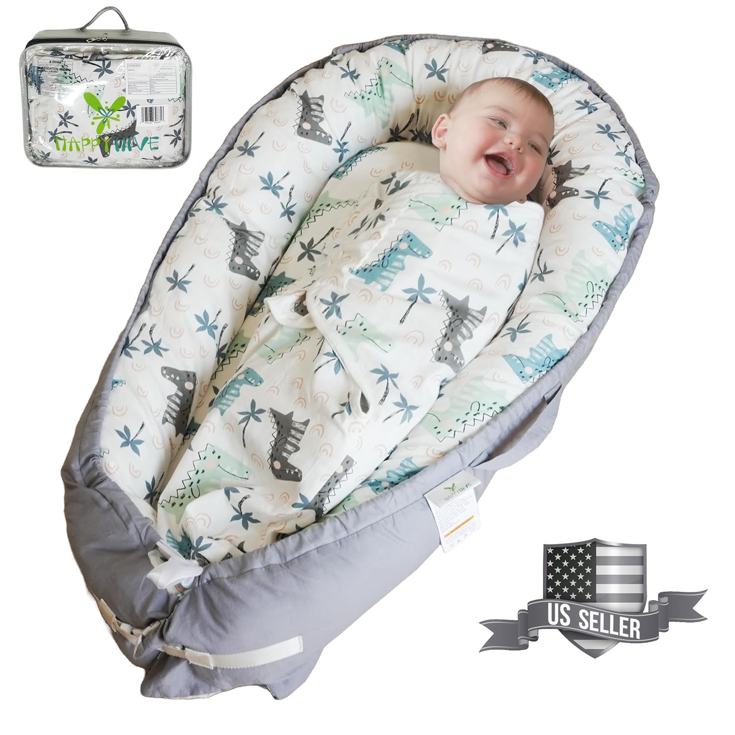 Customers love the baby lounger’s dinosaur print design and find it comfortable and super soft, with one noting its ergonomic support. They appreciate its safety features, with one mentioning how it eases new parents’ stress, and its portability, with one highlighting its convenience for day trips. Customers find the product easy to clean and consider it a perfect gift for baby showers. They like the included swaddle wrap and enjoy using it for tummy time.