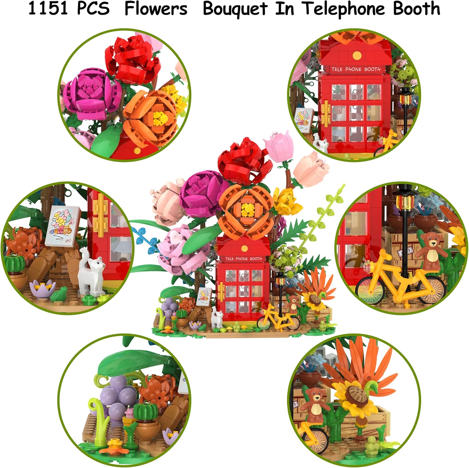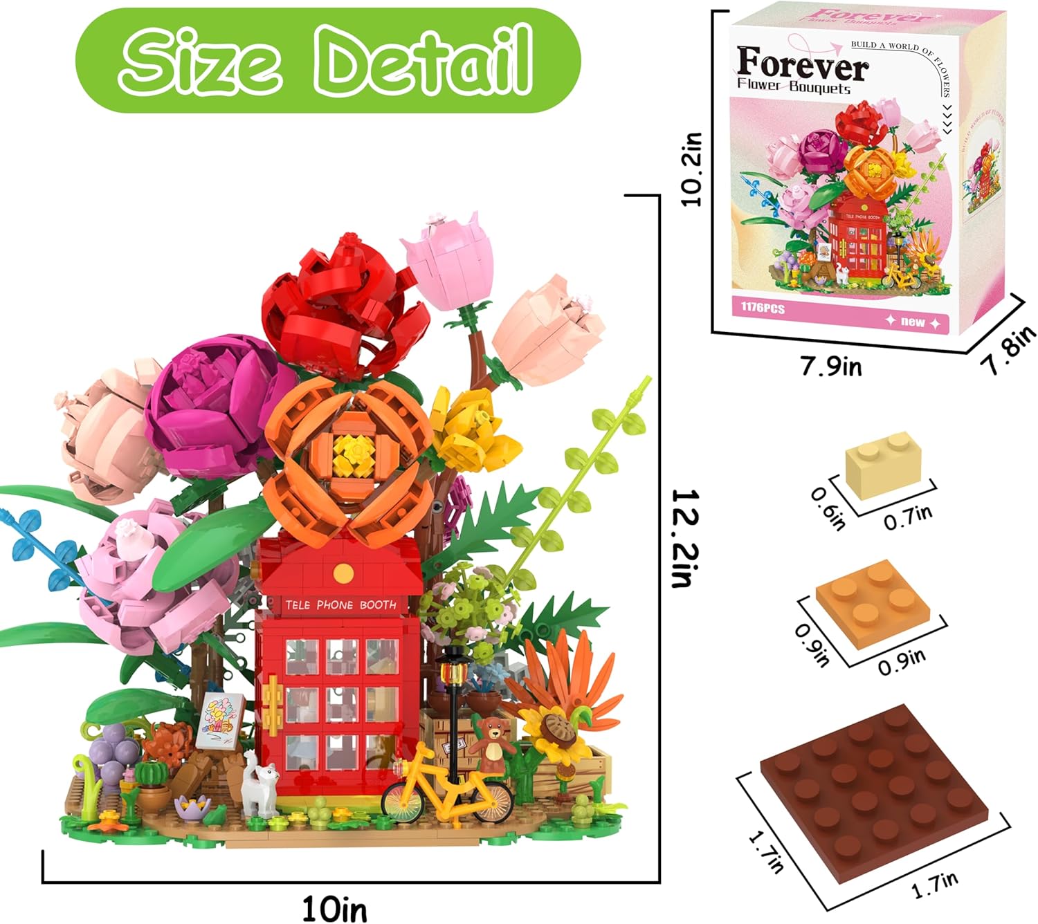 【1176 Pcs Bloom Forever Artificial Flowers】:Are you looking for a unique valentine’s day gifts for her?Mother’s Day gift for your mom? This Flower Bouquet Bonsai Fower makes a unique valentines gifts mothers day gifts birthday gift for womem or meaningful project, creating a beautiful flower display model made entirely from mini bricks. Our Flower Bouquets with base are consist of 10 different flowers, glow in beautiful Tele Phone Booth, and a base with gadget decoration.