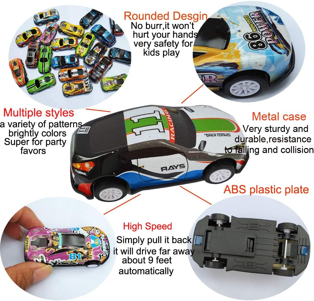 METAL&PLASTIC MATERIAL:These Party favor cars made of metal case,and the bottom plate is made of ABS plastic,Very durable,and rounded design,never hurt your kids hand. the metal case was hooked by the bottom plate,this pull back cars won’t took apart though you played it for a long time.