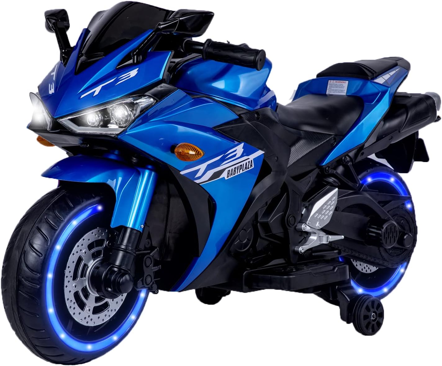Lighting wheels and training wheel – The electric ride on motorcycle’s wheels have lights and the night looks even cooler.There are switches in the control panel to turn on and off the lights on the wheels.ride on toys with suspension and Featuring a training wheel on each side, keeps your kids safe whether they turn left, right. Furthermore, it is easy to operate. Your kid just needs to turn on the switch and choose to move forward or backward. Then Turn the right handle and go!