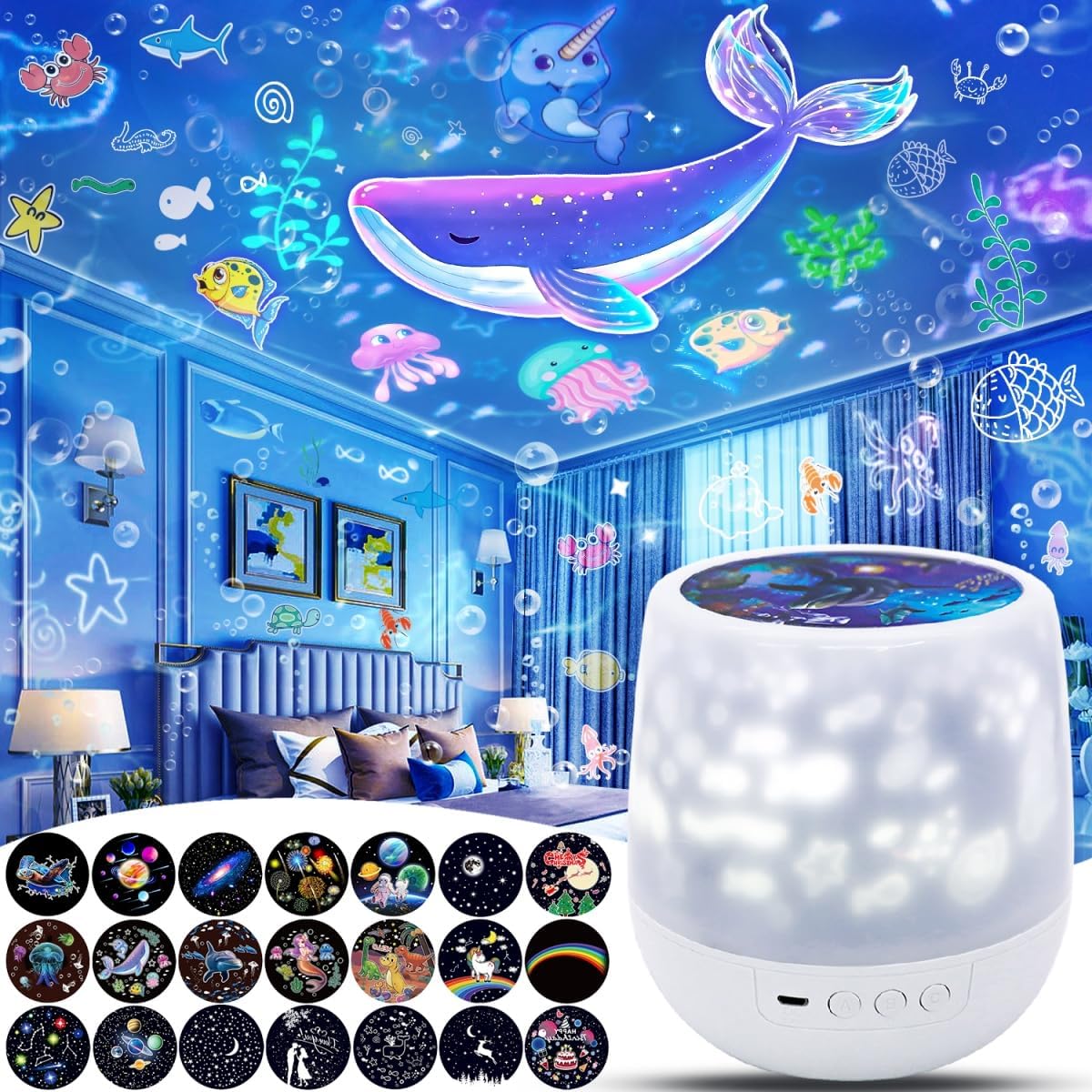 21 sets of projection films: Jellyfishs, Whales, Unicorn, Dinosaurs, Dolphins, Mermaids, Rainbows, Constellations, Moonlit Deer, Fountain Whales, Moon, Solar System, Happy Birthday, Merry Christmas, Happy Valentine’s Day, Sea Turtle, Color Planet, Galaxy, Fireworks, Astronaut, Moon.