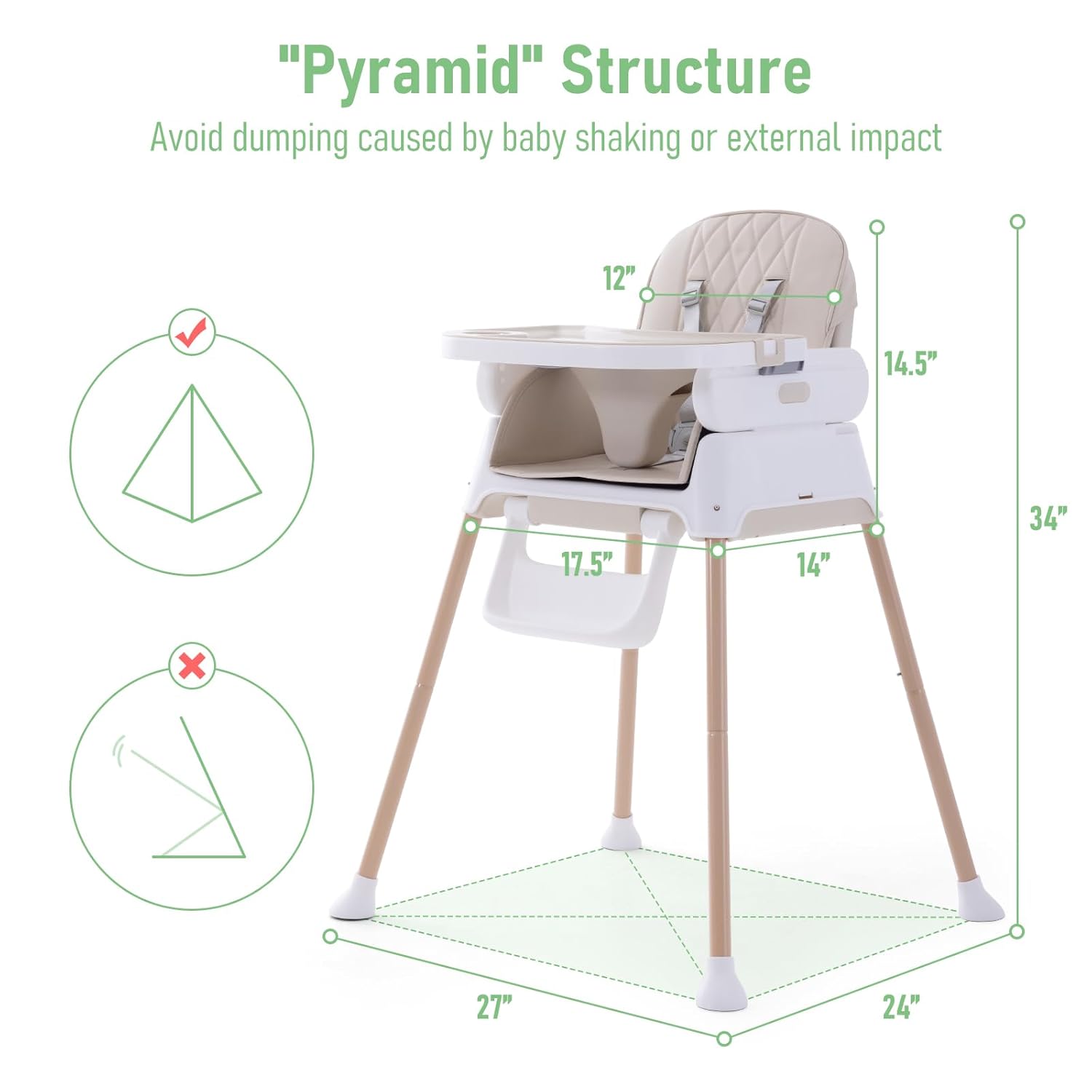 🏵️Safe Baby Chair: With pyramid-shaped and a steel frame, non-slip feet, together with 5 point harness belt, this baby high chair provides a stable and sturdy seat for your baby. There are additional seat belts at the bottom of the seat, and the booster seat can be securely attached to different types of dining chairs.