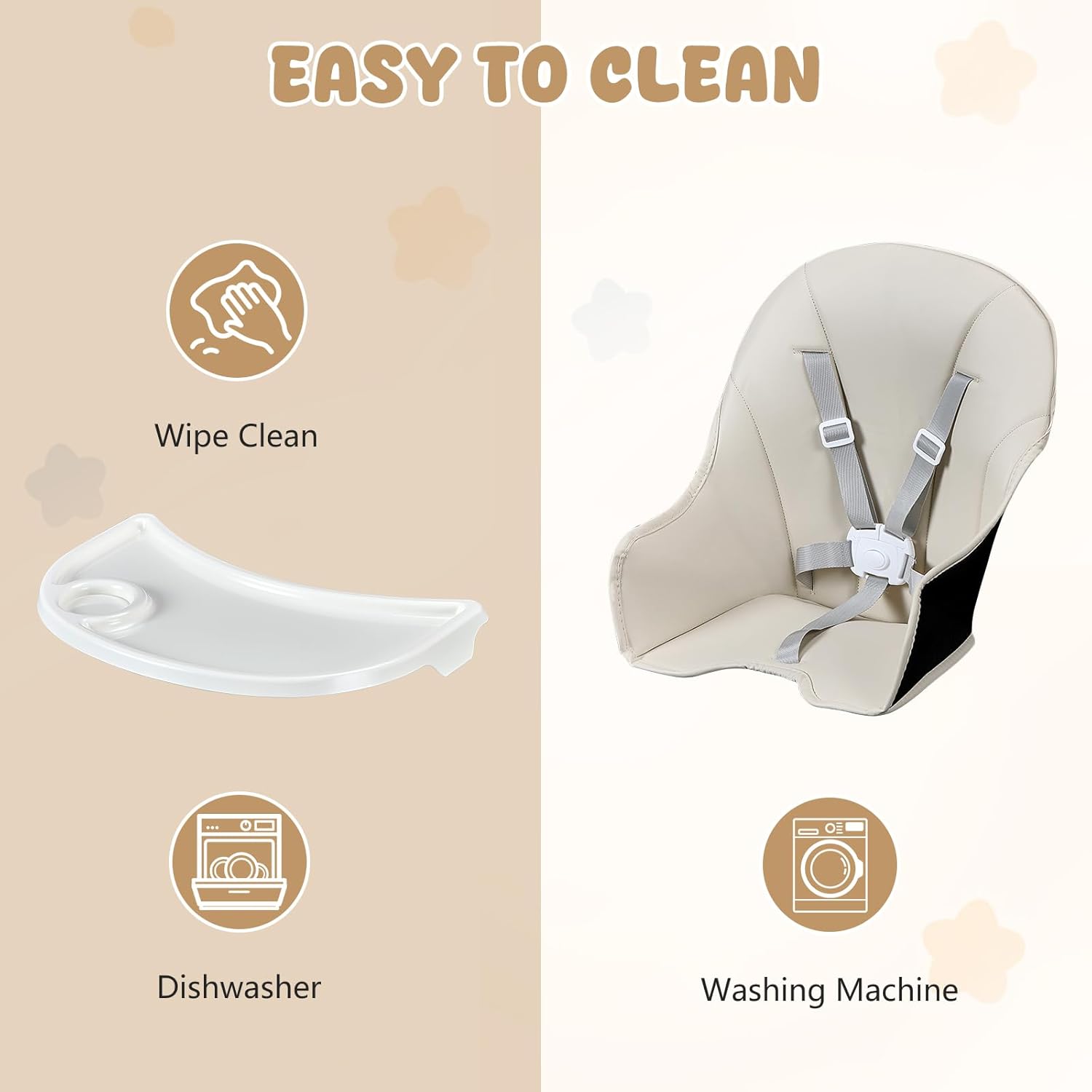 Easy to clean:Our baby high chair is easy to clean, you can put the upper tray in the dishwasher, and the waterproof cushions can be simply scrubbed so that parents can easily complete the cleanup.