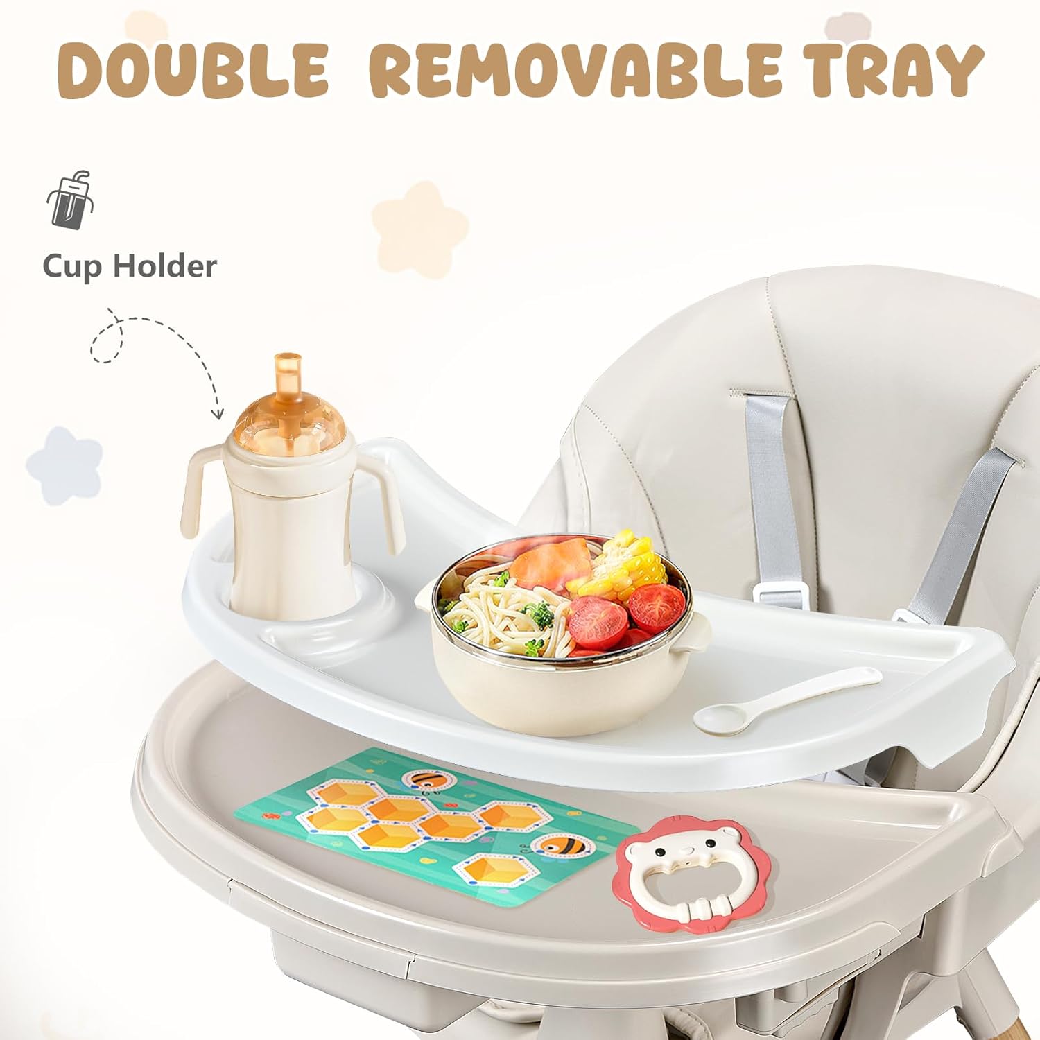 Multifunctional high chair:Our high chair is easy to assemble and you can easily put it together. Remove the lower half of the chair legs and tray, it can also be converted into a toddler chair. The baby chair has a double layer tray, the upper layer is used for baby’s eating and the lower layer can be used for baby’s playing.