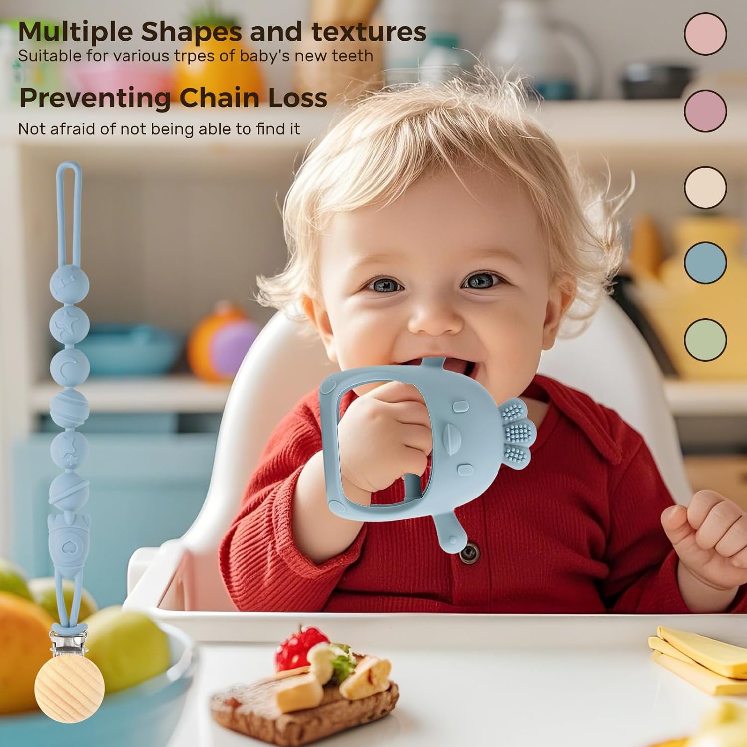 【Anti Drop Teether & Safe Silicone Chains】You will be glad to carry a silicone chain with you when your baby wants to go outside, or when they may become temporarily restless and throw away the teethers.in case that you keep picking up teethers from ground all the time. After all, teethers should always be kept clean.Plus,the chains can be used with other relief pacifier.The most important thing is the length of the chain is based on the standard length ensure that it won’t cause any harm