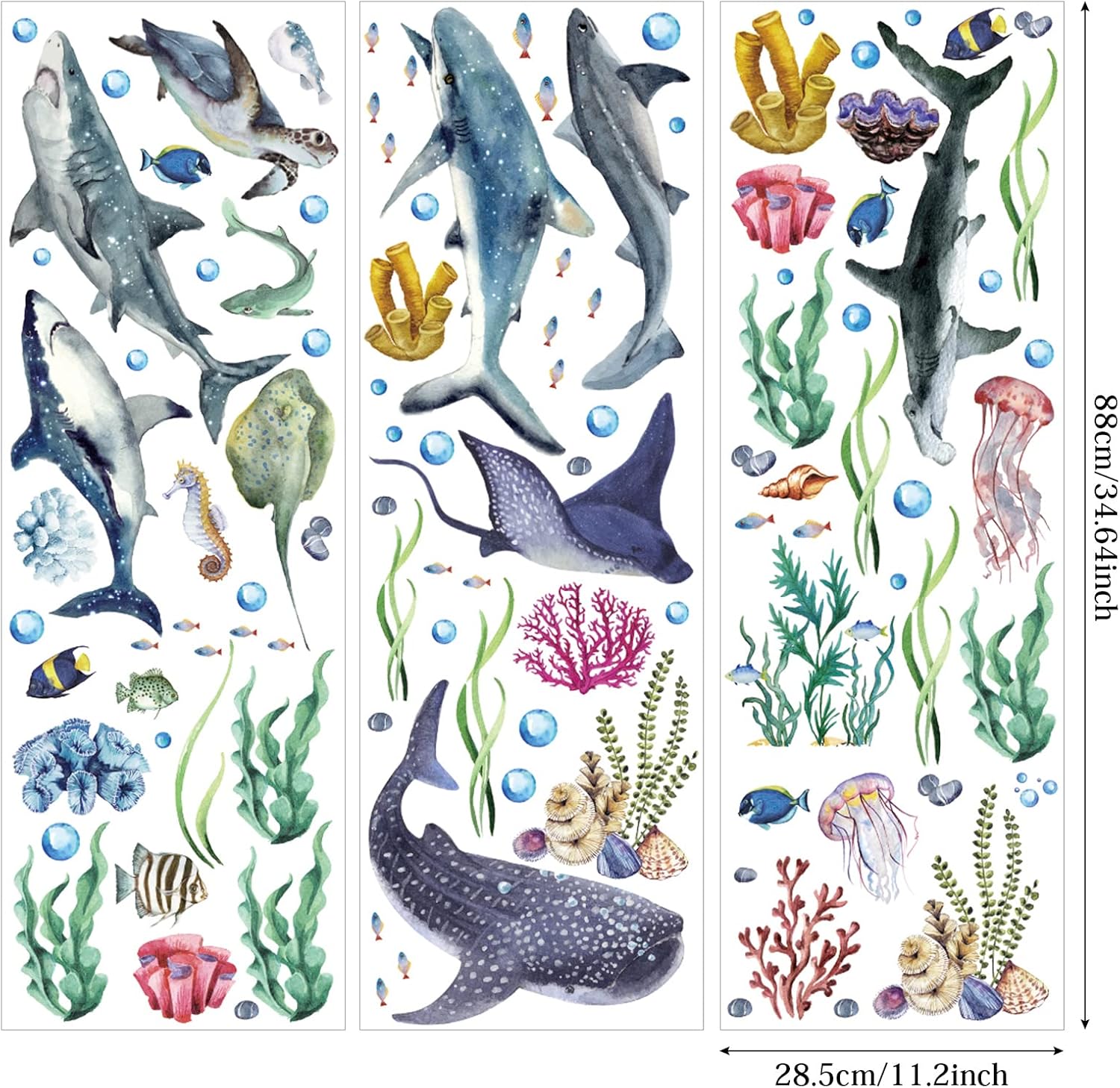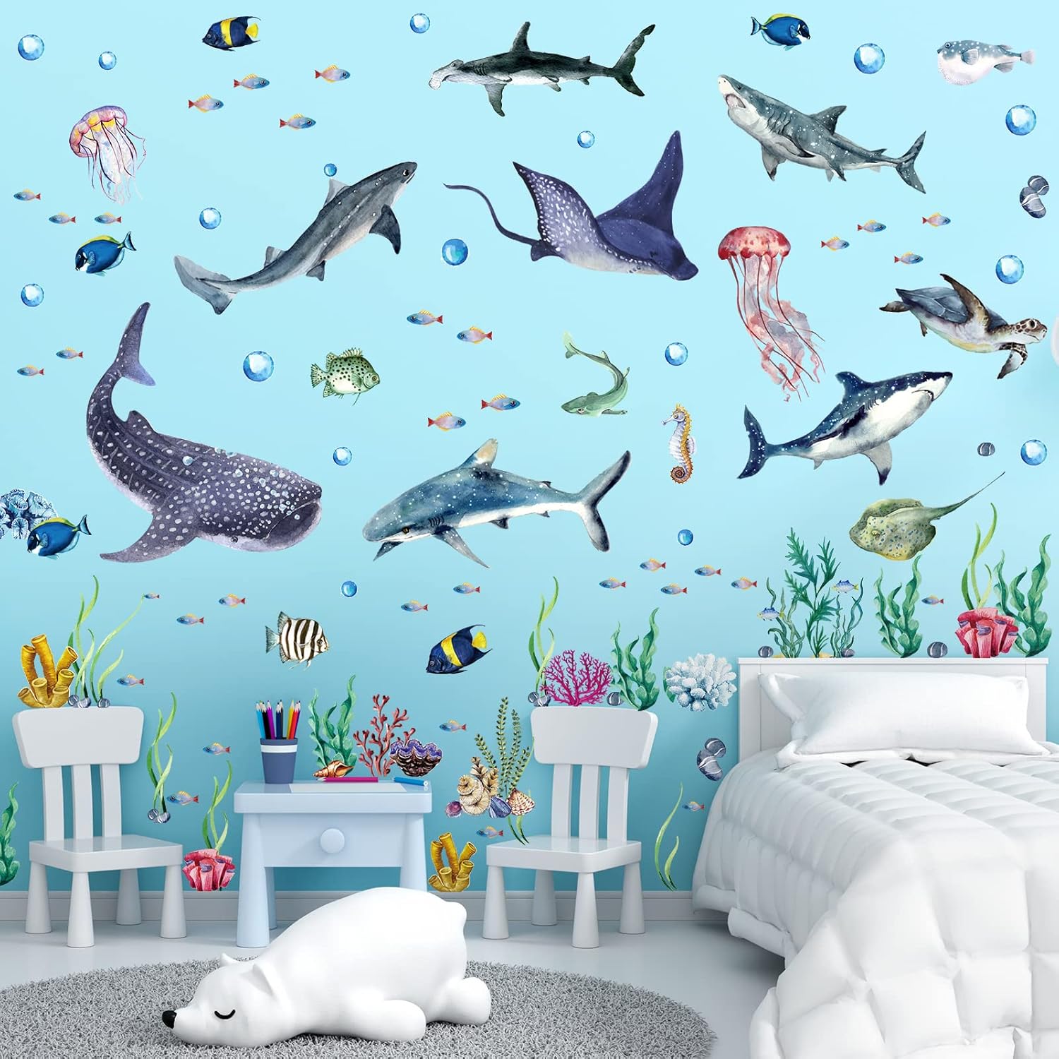 Novel Design and Versatile: this ocean wall decal can be applied to wall decorations and photo props, pasting to anywhere you like to decorate your room; Combined sharks and other ocean animals, it immediately became interesting and the focus of the family