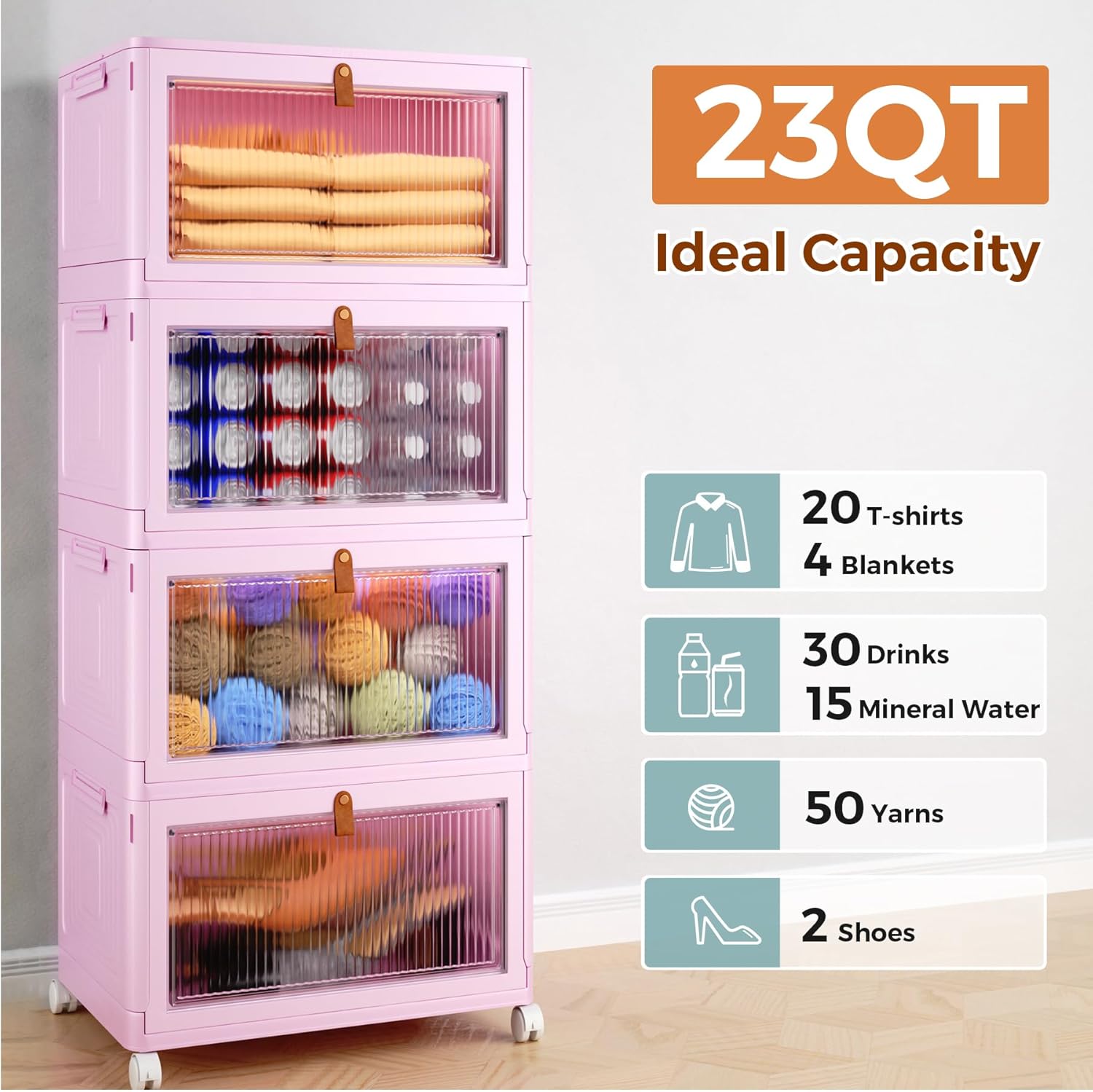 Large Capacity & Upgraded Material – The storage bins measure 14.76 x 11 x 8.27 inches(23 QT capacity) on each floor, and the 4-layer stacked as a whole measures 15.35 x 11 x 32.68 in (height included wheels), with a total capacity of 92 QT. Our storage containers with lids are made of high-quality PP materials for long service life.