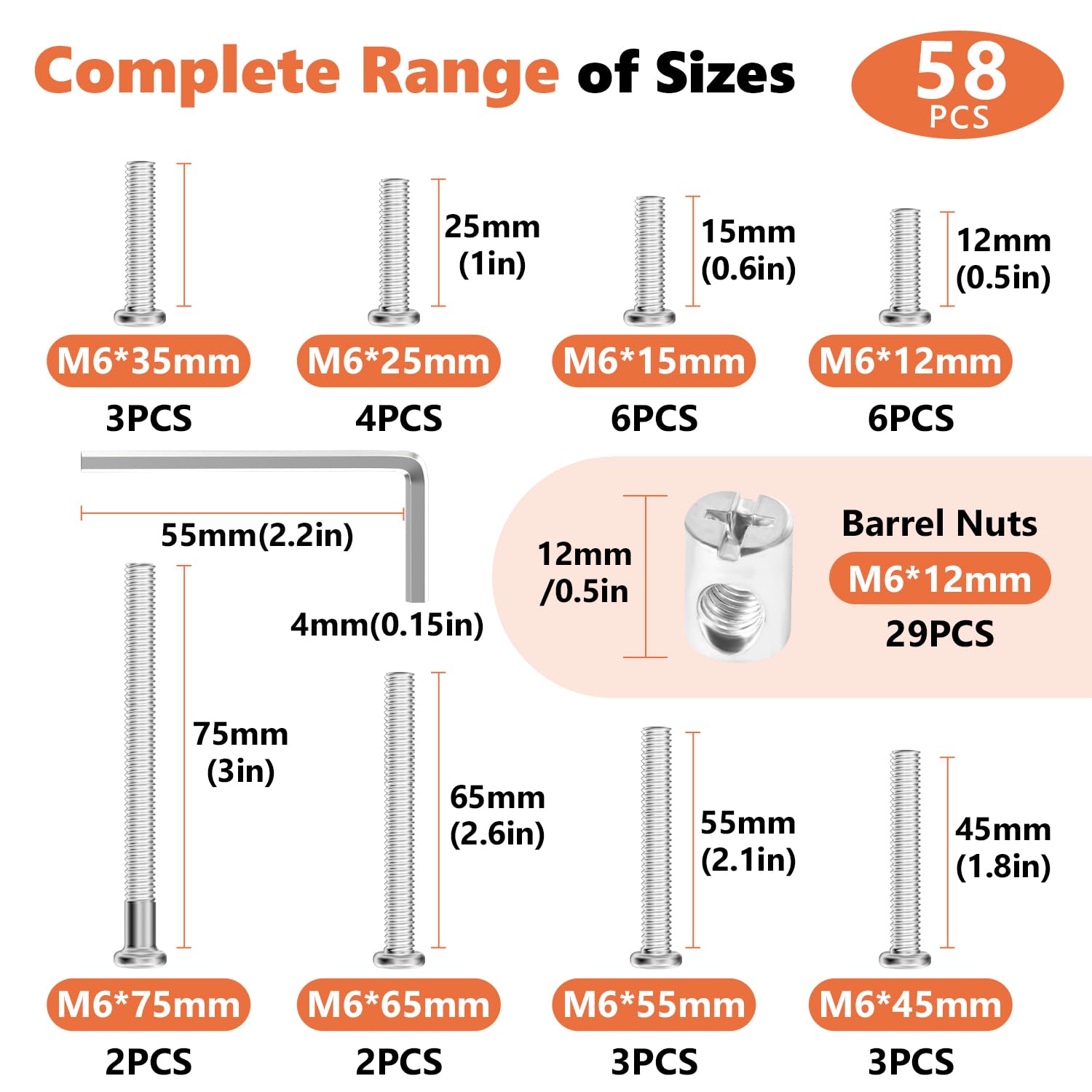 – Sizes:29pcs M6 x 12mm/15mm/25mm/ 35mm/45mm/55mm/65mm/75mm and 29pcs m6x12mm barrel nuts.