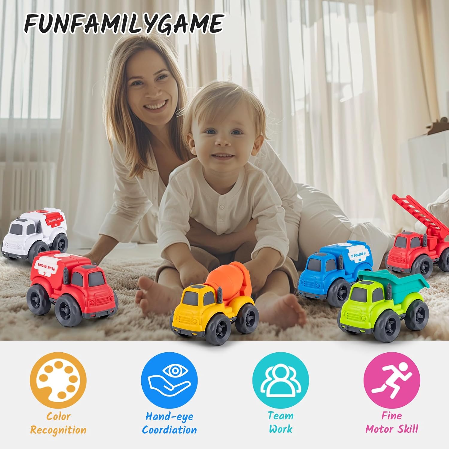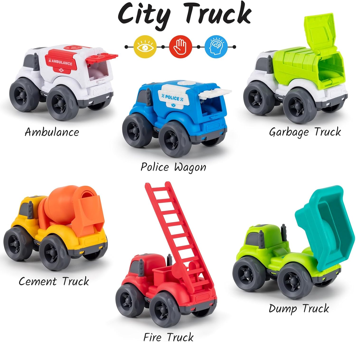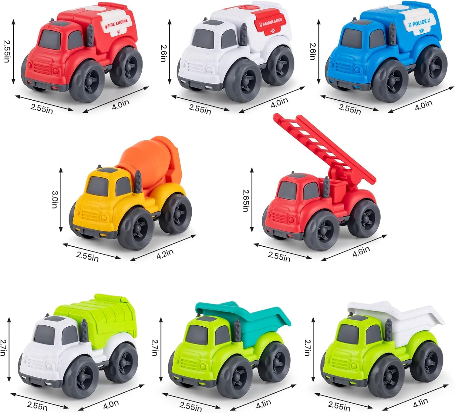 【8 in 1 Trucks Toys Set】8 in 1 truck toys set, including 2*fire truck & ambulance & cement mixer truck & 2*dump truck & police cars & garbage truck.The reduced version of the truck toy can better stimulate children’s curiosity and encouraging hand-eye coordination. Different in shapes and bright colors of truck cars deeply attract children’ attention and cultivate their patience and observation. allow your baby to recognize and identify 6 types of cars.