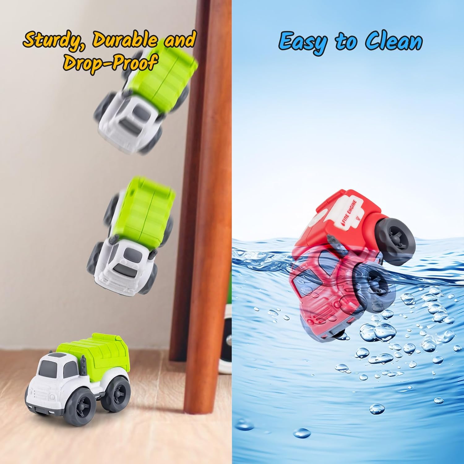 Non-Toxic, BPA Free. There are no sharp edges or corners that can hurt your child. Made from child-friendly material, this car toy set is both safe and durable for children to play with.Dive into fun with our bath toys! Let the excitement flow as your kids play with these toys in the waterBright and colorful. Friction powered, no battery needed. Just pull it back and let it go forward naturally, the smooth wheels can keep the car running for a long time.