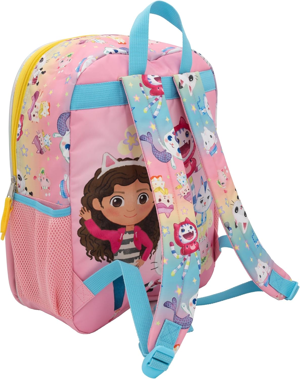 Gabby’s Dollhouse Girls Backpack: This bright colorful fun backpack will make any Gabby fan “Over the Rainbow”! The school bag set features character applique patches of Gabby, Pandy Paws, and Cakey with iridescent PU rainbow stripes filled with confetti.
