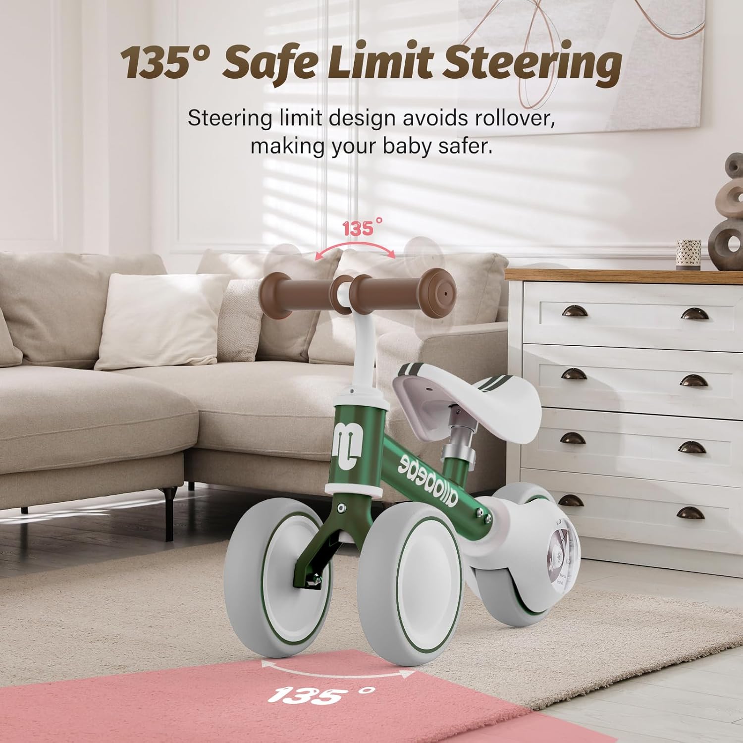Silent Wheels for Indoor & Outdoor Play – The no-pedal bike moves silently, which makes it perfect for indoor and outdoor play. It won’t damage your floors and can run smoothly in gardens or other flat surfaces. However, we don’t suggest riding it on slopes, streets, roads, bumps, muddy, or wet roads. As always, never leave your baby alone when they are playing.