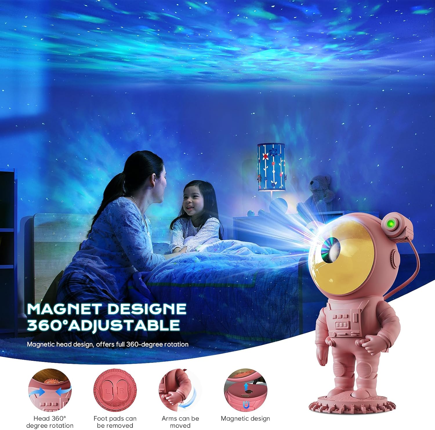 [Projection Angle Adjustable] This night light starry projector is designed to look like an astronaut, and the astronaut’s head is magnetically connected to the body for easy adjustment of the nebula projection angle; In addition, the moon base is removable and the arm can also be posed, which makes it not only a galaxy star projector but also a good-looking decorative ornament