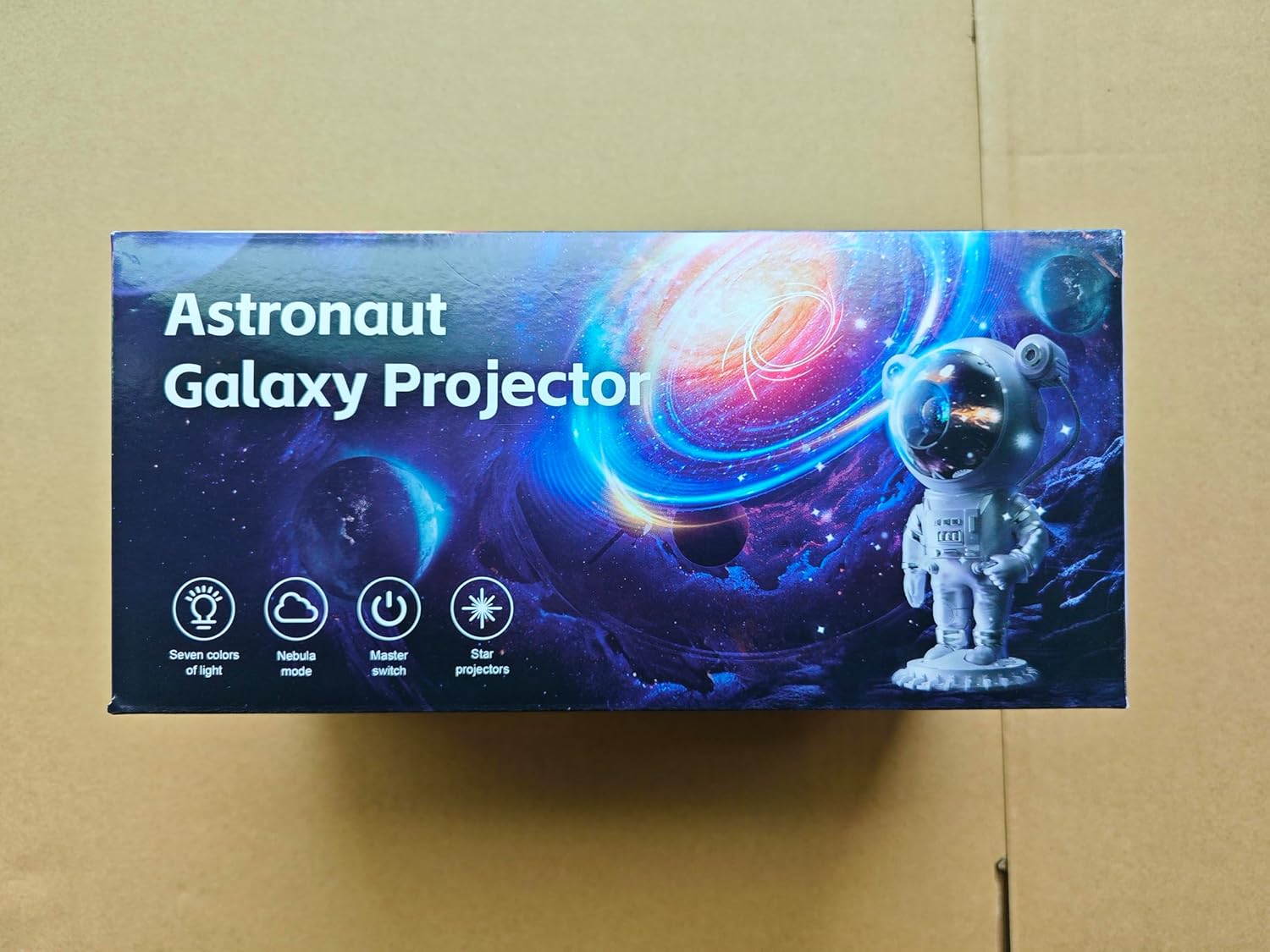 [Manual Switch, Remote Control & Timer] You have 2 ways to switch on the astronaut projector: the back buttons and the remote control. The back button can only turn on the projector, fog and star switch and long press to turn it off; the remote control can set colours, speed and brightness of fog and star, as well as the timer (45 minutes or 90 minutes automatically turn off).