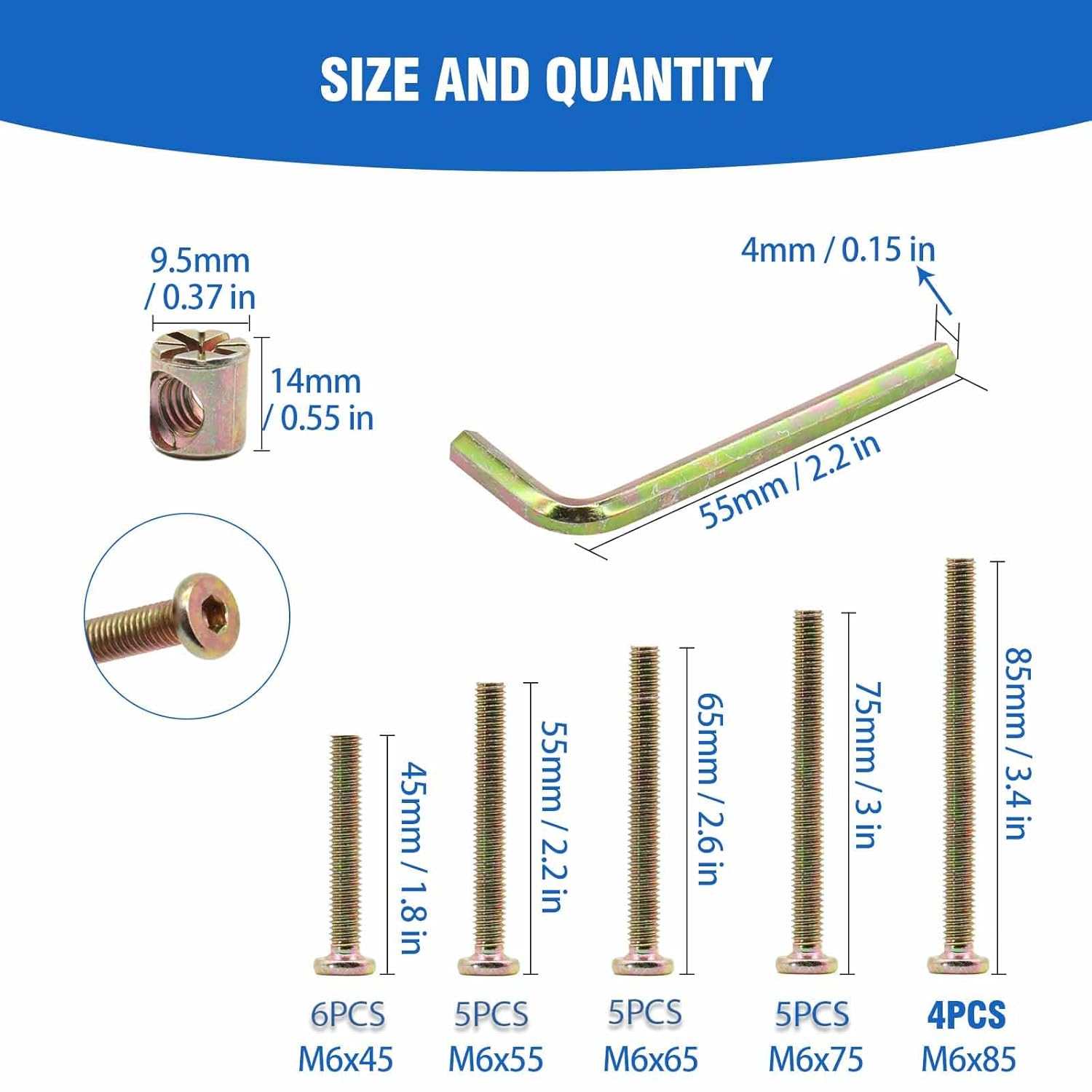 Crib Screws Size Include: M6 x 45mm 6Pcs;M6 x 55mm 5Pcs;M6 x 65mm 5Pcs; M6 x 75mm 5Pcs;M6 x 85mm 4Pcs and m6x13mm barrel nuts,1pc m6 wrench.