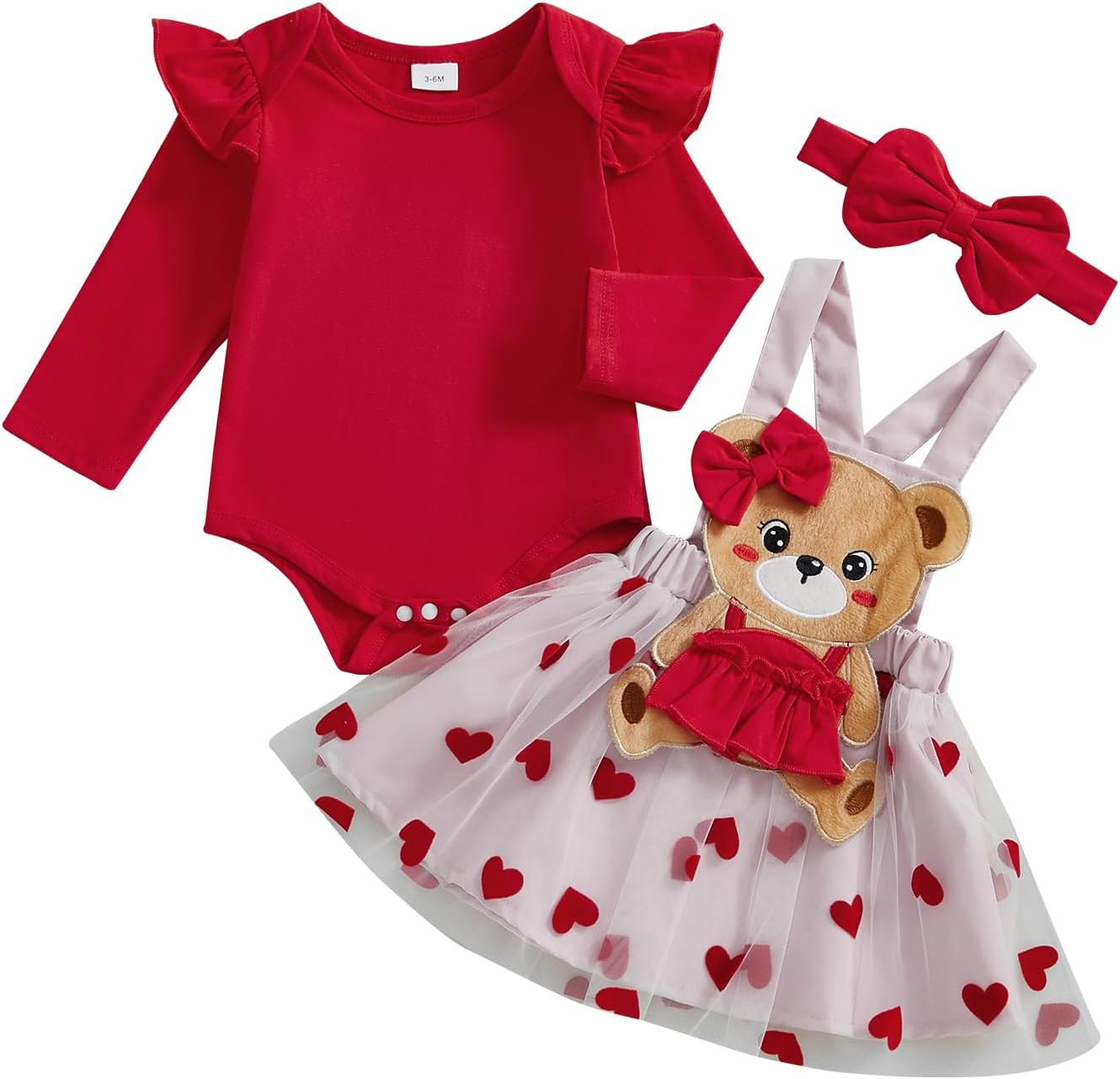 Baby Girl Valentine’s Day Outfits Long Sleeve Romper + Tulle Suspender Skirt + Headband Set