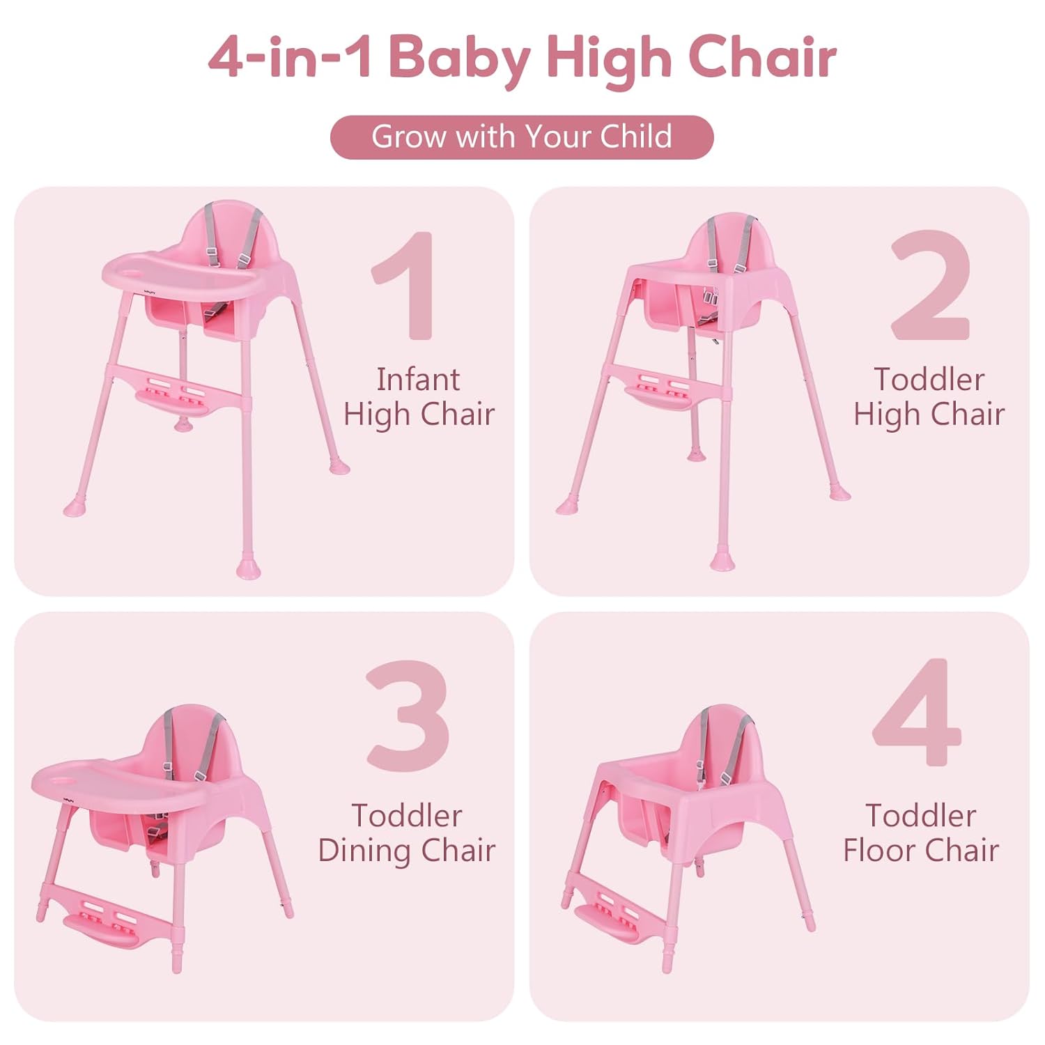 Grow with Your Child: This 4-in-1 baby high chair can grow with your child from infancy to toddlerhood, which effortlessly converts into an infant high chair, a toddler high chair, toddler dining chair and toddler floor chair. Suitable age: 6 months-3 years old.