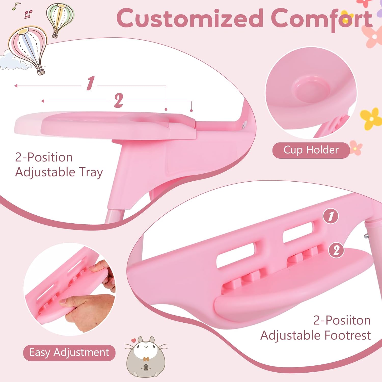 Customized Comfort: This toddler dining chair can cater to your baby’s different stages and sizes with a 2-position adjustable tray and a 2-postion adjustable footrest. This flexible feature allows easy adjustment to fit snugly around your baby for comfortable feeding times.
