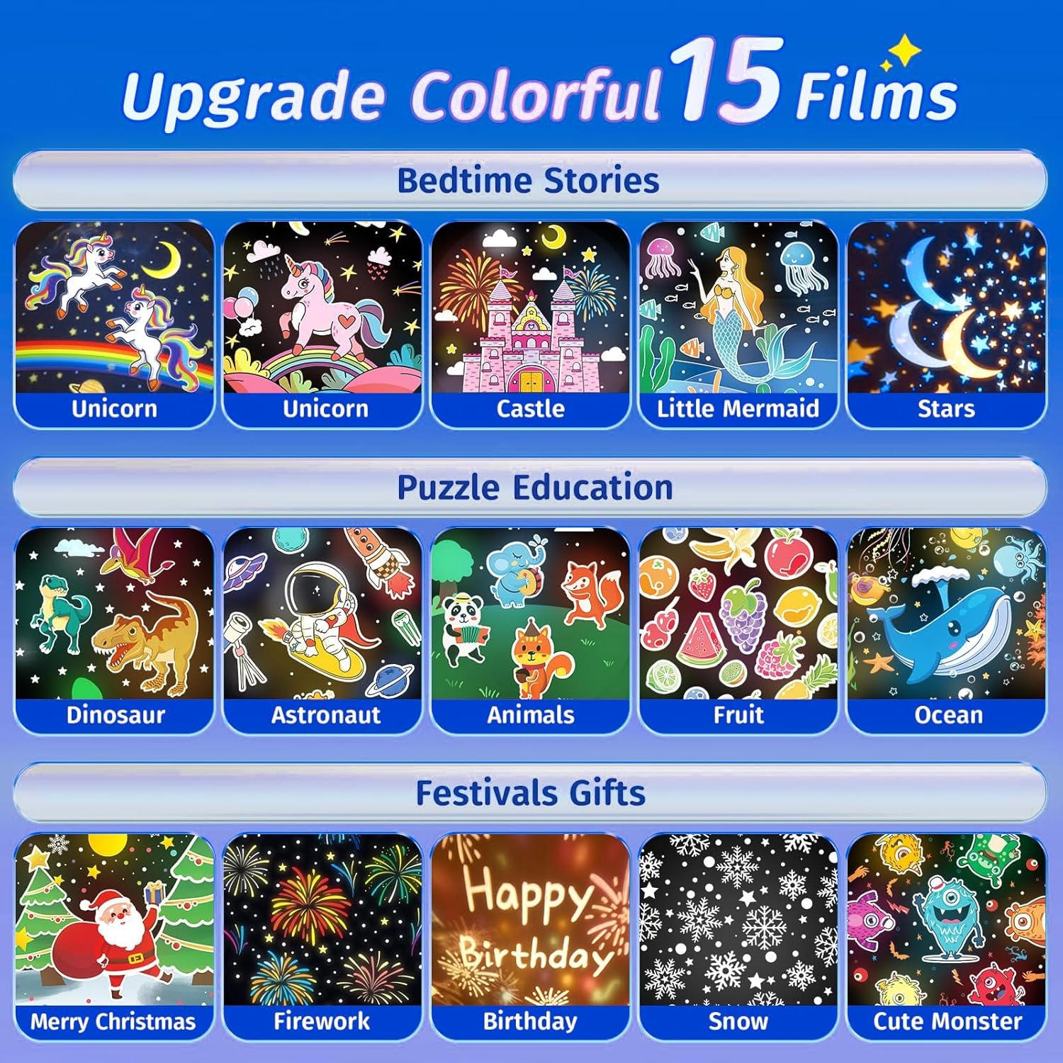 🐰【15 Films for Baby Night Light Projector】The toddler night light projector night light for kids comes with upgraded 15 films, which can display different patterns after removing the stacked lamp shade. Different themes feel different. For example, the star and moon theme makes toddler night light projector night light for kids room full of scattered stars and moonlight, u can also feel the romance of the vast starry sky indoors.The rich ocean world and animal world theme turns the baby night lights for nursery/light projector for kids room into a beautiful animal world, and u can even see the gorgeous unicorn world and cool dinosaur world,which can develop their understanding of the world.