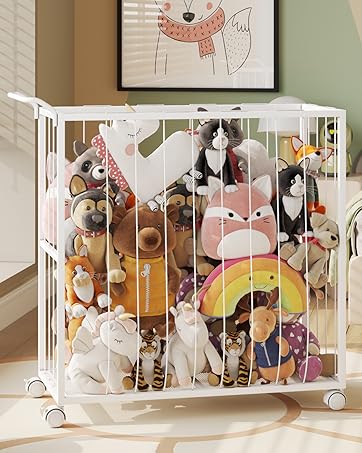 [Sturdy & Durable]Built from a combination of iron and wood for stability, with a thickened pine wood structure for durability.Mesh netting at the bottom prevents toys from falling out when moving the stuffed animal holder